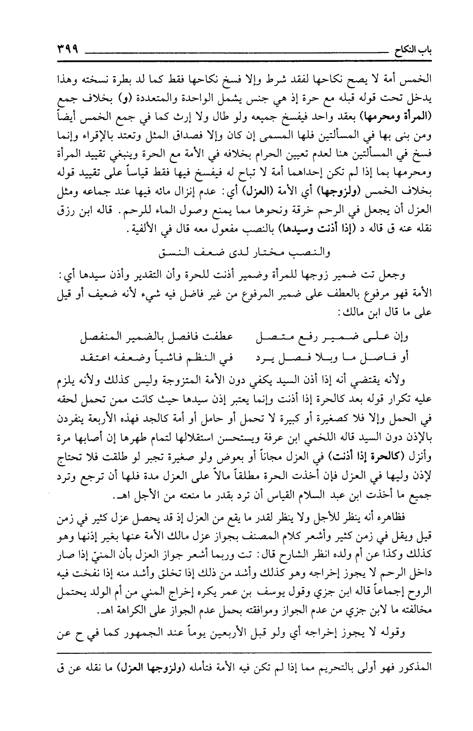 الخمس أمة لا يصح نكاحها لفقد شرط وإلا فسخ نكاحها فقط كما لد بطرة نسخته وهذا يدخل تحت قوله قبله مع حرة إذ هي جنس يشمل الواحدة والمتعددة (و) بخلاف جمع (المرأة ومحرمها) بعقد واحد فيفسخ جميعه ولو طال ولا إرث كما في جمع الخمس أيضًا ومن بنى بها في المسألتين فلها المسمى إن كان وإلا فصداق المثل وتعتد بالإقراء وإنما فسخ في المسألتين هنا لعدم تعيين الحرام بخلافه في الأمة مع الحرة وينبغي تقييد المرأة ومحرمها بما إذا لم تكن إحداهما أمة لا تباح له فيفسخ فيها فقط قياسًا على تقييد قوله بخلاف الخمس (ولزوجها) أي الأمة (العزل) أي: عدم إنزال مائه فيها عند جماعه ومثل العزل أن يجعل في الرحم خرقة ونحوها مما يمنع وصول الماء للرحم. قاله ابن رزق نقله عنه في قاله د (إذا أذنت وسيدها) بالنصب مفعول معه قال في الألفية.