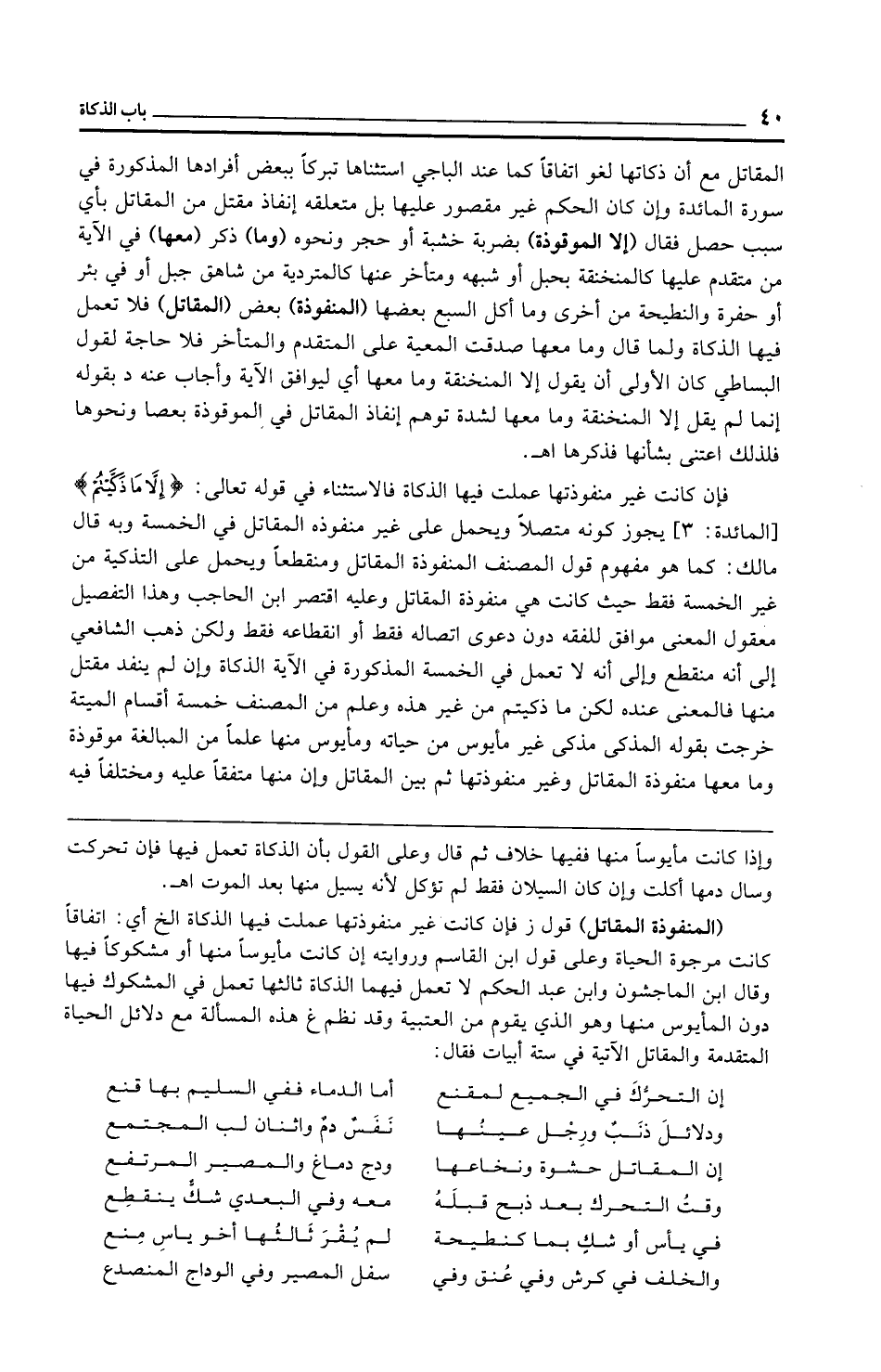 فإن كانت غير منفوذتها عملت فيها الذكاة فالاستثناء في قوله تعالى: {إِلَّا مَا ذَكَّيْتُمْ} [المائدة: 3] يجوز كونه متصلًا ويحمل على غير منفوذه المقاتل في الخمسة وبه قال مالك: كما هو مفهوم قول المصنف المنفوذة المقاتل ومنقطعًا ويحمل على التذكية من غير الخمسة فقط حيث كانت هي منفوذة المقاتل وعليه اقتصر ابن الحاجب وهذا التفصيل معقول المعنى موافق للفقه دون دعوى اتصاله فقط أو انقطاعه فقط ولكن ذهب الشافعي إلى أنه منقطع وإلى أنه لا تعمل في الخمسة المذكورة في الآية الذكاة وإن لم ينفد مقتل منها فالمعنى عنده لكن ما ذكيتم من غير هذه وعلم من المصنف خمسة أقسام الميتة خرجت بقوله المذكى مذكى غير مأيوس من حياته ومأيوس منها علمًا من المبالغة موقوذة وما معها منفوذة المقاتل وغير منفوذتها ثم بين المقاتل وإن منها متفقًا عليه ومختلفًا فيه