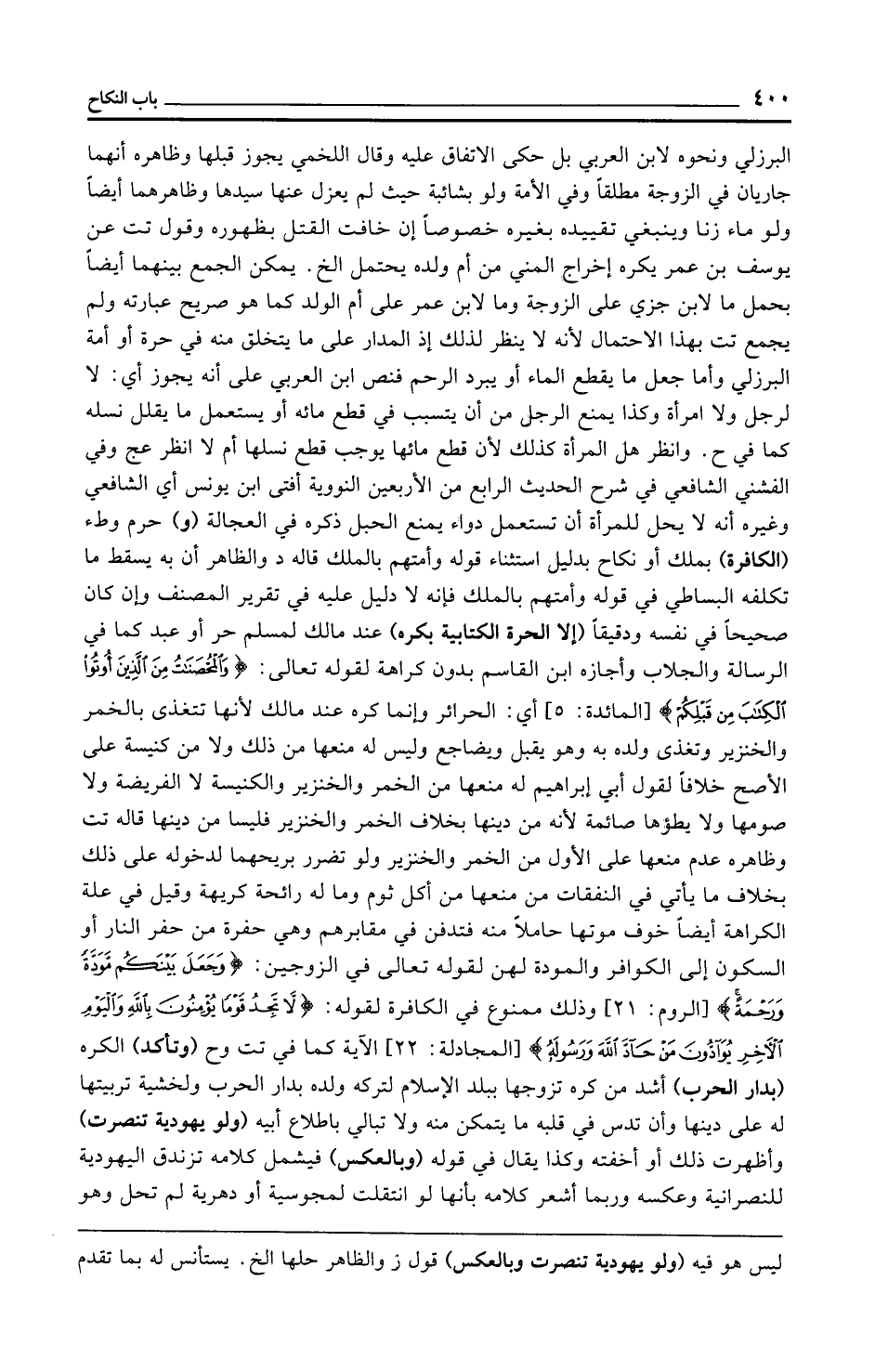 البرزلي ونحوه لابن العربي بل حكى الاتفاق عليه وقال اللخمي يجوز قبلها وظاهره أنهما جاريان في الزوجة مطلقًا وفي الأمة ولو بشائبة حيث لم يعزل عنها سيدها وظاهرهما أيضًا ولو ماء زنا وينبغي تقييده بغيره خصوصًا إن خافت القتل بظهوره وقول تت عن يوسف بن عمر يكره إخراج المني من أم ولده يحتمل الخ. يمكن الجمع بينهما أيضًا بحمل ما لابن جزي على الزوجة وما لابن عمر على أم الولد كما هو صريح عبارته ولم يجمع تت بهذا الاحتمال لأنه لا ينظر لذلك إذ المدار على ما يتخلق منه في حرة أو أمة البرزلي وأما جعل ما يقطع الماء أو يبرد الرحم فنص ابن العربي على أنه يجوز أي: لا لرجل ولا امرأة وكذا يمنع الرجل من أن يتسبب في قطع مائه أو يستعمل ما يقلل نسله كما في ح. وانظر هل المرأة كذلك لأن قطع مائها يوجب قطع نسلها أم لا انظر عج وفي الفشني الشافعي في شرح الحديث الرابع من الأربعين النووية أفتى ابن يونس أي الشافعي وغيره أنه لا يحل للمرأة أن تستعمل دواء يمنع الحبل ذكره في العجالة (و) حرم وطء (الكافرة) بملك أو نكاح بدليل استثناء قوله وأمتهم بالملك قاله د والظاهر أن به يسقط ما تكلفه البساطي في قوله وأمتهم بالملك فإنه لا دليل عليه في تقرير المصنف وإن كان صحيحًا في نفسه ودقيقًا (إلا الحرة الكتابية بكره) عند مالك لمسلم حر أو عبد كما في الرسالة والجلاب وأجازه ابن القاسم بدون كراهة لقوله تعالى: {وَالْمُحْصَنَاتُ مِنَ الَّذِينَ أُوتُوا الْكِتَابَ مِنْ قَبْلِكُمْ} [المائدة: 5] أي: الحرائر وإنما كره عند مالك لأنها تتغذى بالخمر والخنزير وتغذى ولده به وهو يقبل ويضاجع وليس له منعها من ذلك ولا من كنيسة على الأصح خلافًا لقول أبي إبراهيم له منعها من الخمر والخنزير والكنيسة لا الفريضة ولا صومها ولا يطؤها صائمة لأنه من دينها بخلاف الخمر والخنزير فليسا من دينها قاله تت وظاهره عدم منعها على الأول من الخمر والخنزير ولو تضرر بريحهما لدخوله على ذلك بخلاف ما يأتي في النفقات من منعها من أكل ثوم وما له رائحة كريهة وقيل في علة الكراهة أيضًا خوف موتها حاملًا منه فتدفن في مقابرهم وهي حفرة من حفر النار أو السكون إلى الكوافر والمودة لهن لقوله تعالى في الزوجين: {وَجَعَلَ بَيْنَكُمْ مَوَدَّةً وَرَحْمَةً} [الروم: 21] وذلك ممنوع في الكافرة لقوله: {لَا تَجِدُ قَوْمًا يُؤْمِنُونَ بِاللَّهِ وَالْيَوْمِ الْآخِرِ يُوَادُّونَ مَنْ حَادَّ اللَّهَ وَرَسُولَهُ} [المجادلة: 22] الآية كما في تت وح (وتأكد) الكره (بدار الحرب) أشد من كره تزوجها ببلد الإسلام لتركه ولده بدار الحرب ولخشية تربيتها له على دينها وأن تدس في قلبه ما يتمكن منه ولا تبالي باطلاع أبيه (ولو يهودية تنصرت) وأظهرت ذلك أو أخفته وكذا يقال في قوله (وبالعكس) فيشمل كلامه تزندق اليهودية للنصرانية وعكسه وربما أشعر كلامه بأنها لو انتقلت لمجوسية أو دهرية لم تحل وهو