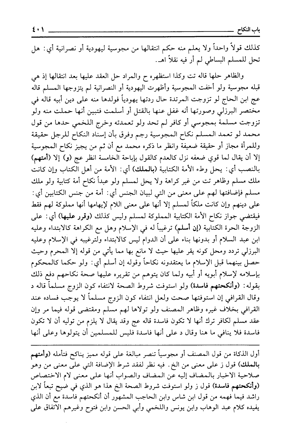أول الذكاة من قول المصنف أو مجوسيًّا تنصر مبالغة على قوله مميز يناكح فتأمله (وأمتهم بالملك) قول ز على معنى من الخ. فيه نظر لفقد شرط الإضافة التي على معنى من وهو صلاحية الأخبار بالمضاف إليه عن المضاف والصواب أنها على معنى لام الاختصاص (وأنكحتهم فاسدة) قول ز ولو استوفت شروط الصحة الخ هذا هو الذي في ضيح تبعًا لابن راشد فيما فهمه من قول ابن شاس وابن الحاجب المشهور أن أنكحتهم فاسدة مع أن الذي يفيده كلام عبد الوهاب وابن يونس واللخمي وأبي الحسن وابن فتوح وغيرهم الاتفاق على