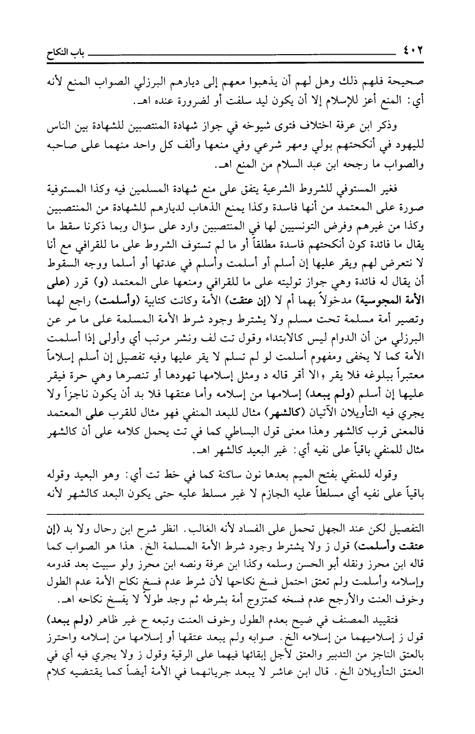 فغير المستوفي للشروط الشرعية يتفق على منع شهادة المسلمين فيه وكذا المستوفية صورة على المعتمد من أنها فاسدة وكذا يمنع الذهاب لديارهم للشهادة من المنتصبين وكذا من غيرهم وفرض التونسيين لها في المنتصبين وارد على سؤال وبما ذكرنا سقط ما يقال ما فائدة كون أنكحتهم فاسدة مطلقًا أو ما لم تستوف الشروط على ما للقرافي مع أنا لا نتعرض لهم ويقر عليها إن أسلم أو أسلمت وأسلم في عدتها أو أسلما ووجه السقوط أن يقال له فائدة وهي جواز توليته على ما للقرافي ومنعها على المعتمد (و) قرر (على الأمة المجوسية) مدخولًا بهما أم لا (إن عتقت) الأمة وكانت كتابية (وأسلمت) راجع لهما وتصير أمة مسلمة تحت مسلم ولا يشترط وجود شرط الأمة المسلمة على ما مر عن البرزلي من أن الدوام ليس كالابتداء وقول تت لف ونشر مرتب أي وأولى إذا أسلمت الأمة كما لا يخفى ومفهوم أسلمت لو لم تسلم لا يقر عليها وفيه تفصيل إن أسلم إسلامًا معتبرًا ببلوغه فلا يقر وإلا أقر قاله د ومثل إسلامها تهودها أو تنصرها وهي حرة فيقر عليها إن أسلم (ولم يبعد) إسلامها من إسلامه وأما عتقها فلا بد أن يكون ناجزًا ولا يجري فيه التأويلان الآتيان (كالشهر) مثال للبعد المنفي فهو مثال للقرب على المعتمد فالمعنى قرب كالشهر وهذا معنى قول البساطي كما في تت يحمل كلامه على أن كالشهر مثال للمنفي باقيًا على نفيه أي: غير البعيد كالشهر اهـ.