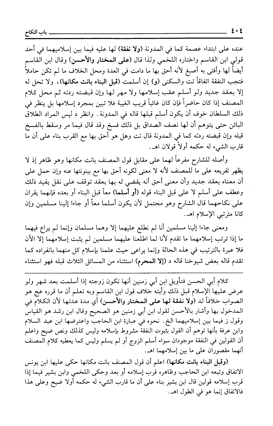 كلام أبي الحسن فتأويل ابن أبي زمنين أنها تكون زوجته إذا أسلمت بعد شهر ولو عرض عليها الإسلام قبل ذلك وأبته خلاف قول ابن القاسم وبه تعلم أن ما قرره عج هو الصواب خلافًا لد (ولا نفقة لها على المختار والأحسن) أي مدة عدتها لأن الكلام في المدخول بها وأشار بالأحسن لقول ابن أبي زمنين هو الصحيح وقال ابن رشد هو القياس وقول ز فيما بين إسلاميهما الخ. نحوه في عبارة ابن الحاجب واعترضها ابن عبد السلام وابن عرفة بأنها توهم أن القول بثبوت النفقة مشروط بإسلامه وليس كذلك ونص ضيح واعلم أن القولين في النفقة موجودان سواء أسلم الزوج أو لم يسلم وليس كما يعطيه كلام المصنف أنهما مقصوران على ما بين إسلامهما اهـ.