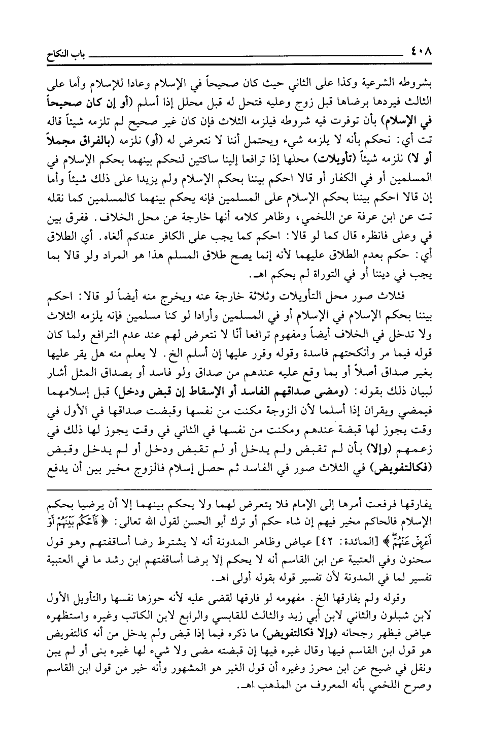بشروطه الشرعية وكذا على الثاني حيث كان صحيحًا في الإسلام وعادا للإسلام وأما على الثالث فيردها برضاها قبل زوج وعليه فتحل له قبل محلل إذا أسلم (أو إن كان صحيحًا في الإسلام) بأن توفرت فيه شروطه فيلزمه الثلاث فإن كان غير صحيح لم تلزمه شيئًا قاله تت أي: نحكم بأنه لا يلزمه شيء ويحتمل أننا لا نتعرض له (أو) نلزمه (بالفراق مجملًا أو لا) نلزمه شيئًا (تأويلات) محلها إذا ترافعا إلينا ساكتين لنحكم بينهما بحكم الإسلام في المسلمين أو في الكفار أو قالا احكم بيننا بحكم الإسلام ولم يزيدا على ذلك شيئًا وأما إن قالا احكم بيننا بحكم الإسلام على المسلمين فإنه يحكم بينهما كالمسلمين كما نقله تت عن ابن عرفة عن اللخمي، وظاهر كلامه أنها خارجة عن محل الخلاف. ففرق بين في وعلى فانظره قال كما لو قالا: احكم كما يجب على الكافر عندكم ألغاه. أي الطلاق أي: حكم بعدم الطلاق عليهما لأنه إنما يصح طلاق المسلم هذا هو المراد ولو قالا بما يجب في ديننا أو في التوراة لم يحكم اهـ.