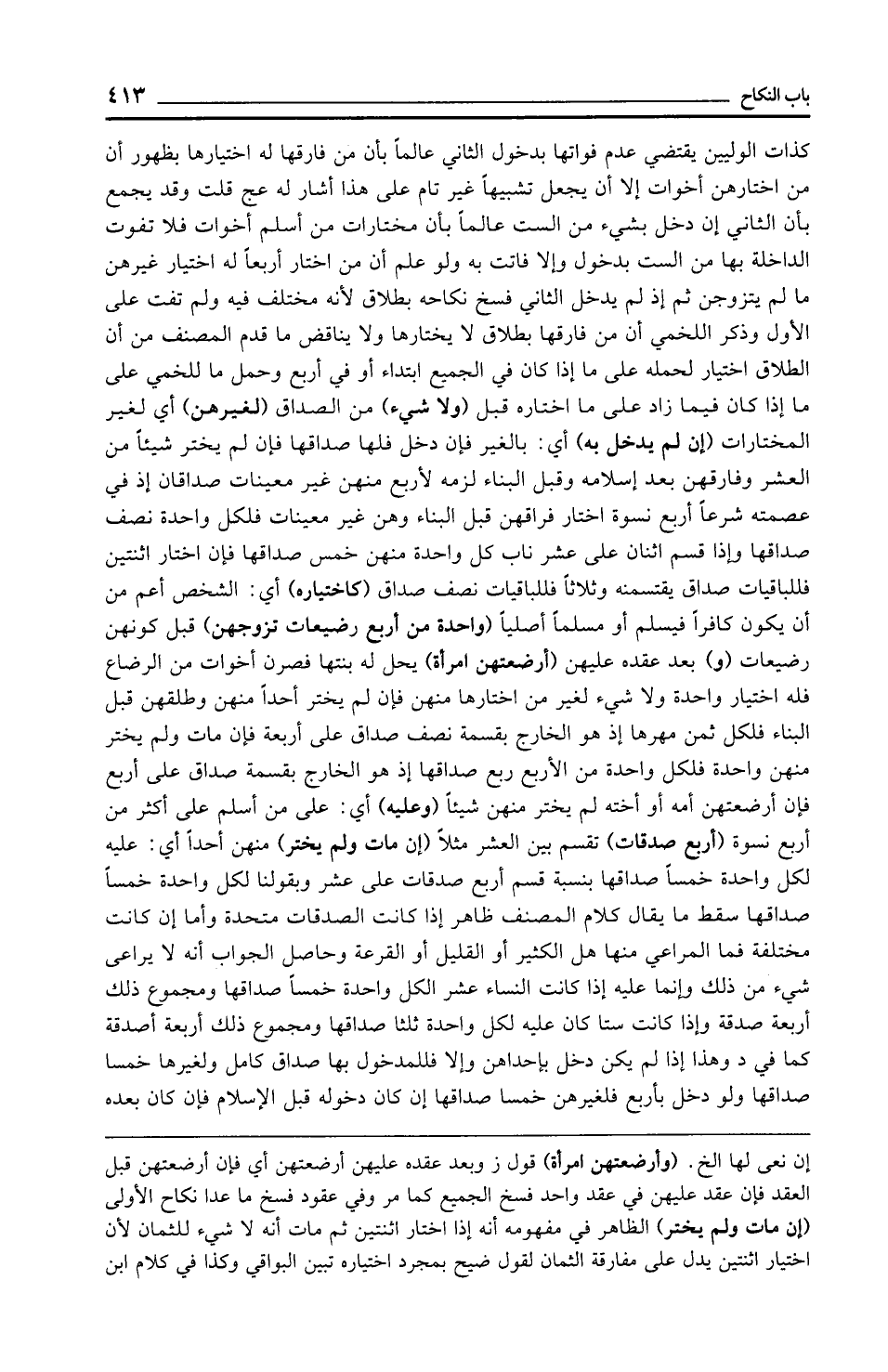 كذات الوليين يقتضي عدم فواتها بدخول الثاني عالمًا بأن من فارقها له اختيارها بظهور أن من اختارهن أخوات إلا أن يجعل تشبيهًا غير تام على هذا أشار له عج قلت وقد يجمع بأن الثاني إن دخل بشيء من الست عالمًا بأن مختارات من أسلم أخوات فلا تفوت الداخلة بها من الست بدخول وإلا فاتت به ولو علم أن من اختار أربعًا له اختيار غيرهن ما لم يتزوجن ثم إذ لم يدخل الثاني فسخ نكاحه بطلاق لأنه مختلف فيه ولم تفت على الأول وذكر اللخمي أن من فارقها بطلاق لا يختارها ولا يناقض ما قدم المصنف من أن الطلاق اختيار لحمله على ما إذا كان في الجميع ابتداء أو في أربع وحمل ما للخمي على ما إذا كان فيما زاد على ما اختاره قبل (ولا شيء) من الصداق (لغيرهن) أي لغير المختارات (إن لم يدخل به) أي: بالغير فإن دخل فلها صداقها فإن لم يختر شيئًا من العشر وفارقهن بعد إسلامه وقبل البناء لزمه لأربع منهن غير معينات صداقان إذ في عصمته شرعًا أربع نسوة اختار فراقهن قبل البناء وهن غير معينات فلكل واحدة نصف صداقها وإذا قسم اثنان على عشر ناب كل واحدة منهن خمس صداقها فإن اختار اثنتين فللباقيات صداق يقتسمنه وثلاثًا فللباقيات نصف صداق (كاختياره) أي: الشخص أعم من أن يكون كافرًا فيسلم أو مسلمًا أصليًّا (واحدة من أربع رضيعات تزوجهن) قبل كونهن رضيعات (و) بعد عقده عليهن (أرضعتهن امرأة) يحل له بنتها فصرن أخوات من الرضاع فله اختيار واحدة ولا شيء لغير من اختارها منهن فإن لم يختر أحدًا منهن وطلقهن قبل البناء فلكل ثمن مهرها إذ هو الخارج بقسمة نصف صداق على أربعة فإن مات ولم يختر منهن واحدة فلكل واحدة من الأربع ربع صداقها إذ هو الخارج بقسمة صداق على أربع فإن أرضعتهن أمه أو أخته لم يختر منهن شيئًا (وعليه) أي: على من أسلم على أكثر من أربع نسوة (أربع صدقات) تقسم بين العشر مثلًا (إن مات ولم يختر) منهن أحدًا أي: عليه لكل واحدة خمسًا صداقها بنسبة قسم أربع صدقات على عشر وبقولنا لكل واحدة خمسًا صداقها سقط ما يقال كلام المصنف ظاهر إذا كانت الصدقات متحدة وأما إن كانت مختلفة فما المراعي منها هل الكثير أو القليل أو القرعة وحاصل الجواب أنه لا يراعى شيء من ذلك وإنما عليه إذا كانت النساء عشر الكل واحدة خمسًا صداقها ومجموع ذلك أربعة صدقة وإذا كانت ستًّا كان عليه لكل واحدة ثلثا صداقها ومجموع ذلك أربعة أصدقة كما في د وهذا إذا لم يكن دخل بإحداهن وإلا فللمدخول بها صداق كامل ولغيرها خمسا صداقها ولو دخل بأربع فلغيرهن خمسا صداقها إن كان دخوله قبل الإسلام فإن كان بعده