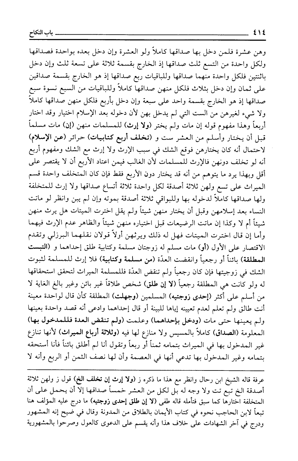 عرفة قاله الشيخ ابن رحال وانظر مع هذا ما ذكره ز (ولا إرث إن تخلف الخ) قول ز ولهن ثلاثة أصدقة الخ تبع تت ولا وجه له بل لكل من العشر خمسًا صداقها إلا أن يحمل على أن المتخلفة اختارها كما سبق فتأمله قاله طفى (لا إن طلق إحدى زوجتيه) ما درج عليه المؤلف هنا تبعًا لابن الحاجب نحوه في كتاب الأيمان بالطلاق من المدونة وقال في ضيح إنه المشهور ودرج في آخر الشهادات على خلاف هذا وأنه يقسم على الدعوى كالعول وصرحوا بالمشهورية