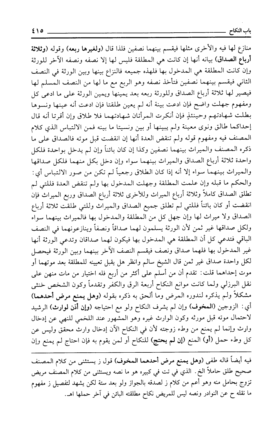منازع لها فيه والأخرى مثلها فيقسم بينهما نصفين فلذا قال (ولغيرها ربعه) وقوله (وثلاثة أرباع الصداق) بيانه أنها إن كانت هي المطلقة فليس لها إلا نصفه ونصفه الآخر للورثة وإن كانت المطلقة هي المدخول بها فلهذه جميعه فالنزاع بينها وبين الورثة في النصف الثاني فيقسم بينهما نصفين فتأخذ نصفه وهو الربع مع ما لها من النصف المسلم لها فيصير لها ثلاثة أرباع الصداق وللورثة ربعه بعد يمينها ويمين الورثة على ما ادعى كل ومفهوم جهلت واضح فإن ادعت بينة أنه لم يعين طلقتا فإن ادعت أنه عينها ونسوها بطلت شهادتهم وحينئذٍ فإن أنكرت المرأتان شهادتهما فلا طلاق وإن أقرتا أنه قال إحداكما طالق ونوى معينة ولم يبينها أو بين ونسيتا ما بينه فمن الالتباس الذي كلام المصنف فيه ومفهوم قوله ولم تنقض العدة أنها إن انقضت قبل موته فالصداق على ما ذكره المصنف والميراث بينهما نصفين وكذا إن كان بائنًا وإن لم يدخل بواحدة فلكل واحدة ثلاثة أرباع الصداق والميراث بينهما سواء وإن دخل بكل منهما فلكل صداقها والميراث بينهما سواء إلا أنه إذا كان الطلاف رجعيًّا لم تكن من صور الالتباس أي: والحكم ما قبله وإن علمت المطلقة وجهلت المدخول بها ولم تنقض العدة فللتي لم تطلق الصداق كاملًا وثلاثة أرباع الميراث وللأخرى ثلاثة أرباع الصداق وربع الميراث فإن انقضت أو كان بائنًا فللتي لم تطلق جميع الصداق والميراث وللتي طلقت ثلاثة أرباع الصداق ولا ميراث لها وإن جهل كل من المطلقة والمدخول بها فالميراث بينهما سواء ولكل صداقها غير ثمن لأن الورثة يسلمون لهما صداقًا ونصفًا وينازعونهما في النصف الباقي فتدعي كل أن المطلقة هي المدخول بها فيكون لهما صداقان وتدعي الورثة أنها غير المدخول بها فلهما صداق ونصف فيقسم النصف الآخر بينهما وبين الورثة فيحصل لكل واحدة صداق غير ثمن قال الشيخ سالم وانظر هل يقبل تعيينه للمطلقة بعد موتهما أو موت إحداهما قلت: تقدم أن من أسلم على أكثر من أربع فله اختيار من مات منهن على نقل البرزلي ولما كانت موانع النكاح أربعة الرق والكفر وتقدمًا وكون الشخص خنثى مشكلًا ولم يذكره لندوره المرض وما ألحق به ذكره بقوله (وهل يمنع مرض أحدهما) أي: الزوجين (المخوف) وإن لم يشرف النكاح ولو مع احتياجه (وإن أذن لوارث) الرشيد لاحتمال موته قبل مورثه وكون الوارث غيره وهو المشهور عند اللخمي للنهي عن إدخال وارث وإنما لم يمنع من وطء زوجته لأن في النكاح الان إدخال وارث محقق وليس عن كل وطء حمل (أو) المنع (إن لم يحتج) للنكاح أو لمن يقوم به فإن احتاج لم يمنع وإن