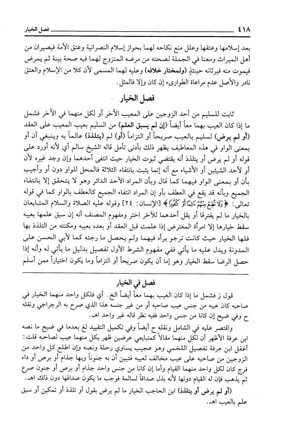 ثابت للسليم من أحد الزوجين على المعيب الآخر أو لكل منهما في الآخر فشمل ما إذا كان العيب بهما معًا أيضًا (إن لم يسبق العلم) من السليم بعيب المعيب على العقد (أو لم يرض) لسليم بالعيب صريحًا أو التزامًا (أو) لم (يتلذذ) عالمًا به وينبغي أن أو بمعنى الواو في هذه المعاطيف يظهر ذلك بأدنى تأمل قاله الشيخ سالم أي لأنه أورد على قوله أو لم يرض أو يتلذذ أنه يقتضي ثبوت الخيار حيث انتفى أحدهما وإن وجد غيره لأن أو لأحد الشيئين أو الأشياء مع أنه إنما يثبت بانتفاء الثلاثة فالمحل للواو دون أو وأجيب بأن أو بمعنى الواو فيهما كما قال وبأن المراد الأحد الدائر وهو لا يتحقق إلا بانتفاء الجميع وبأنه قد يقع في العطف بأو إن المراد بانتفاء الجميع كالعطف بالواو كما في قوله تعالى: {وَلَا تُطِعْ مِنْهُمْ آثِمًا أَوْ كَفُورًا} [الإنسان: 24] وقوله عليه الصلاة والسلام المتبايعان بالخيار ما لم يفترقا أو يقل أحدهما للآخر اختر ومفهوم المصنف أنه إن سبق علمها بعيبه سقط خيارها إلا امرأة المعترض إذا علمت قبل العقد أو بعده بعيبه ومكنته من التلذذ بها فلها الخيار حيث كانت ترجو برأه فيهما ولم يحصل ما رجته كما لأبي الحسن على المدونة ويدل عليه ما يأتي ففي مفهوم الشرط الأول تفصيل بدليل ما يأتي له وأنه إذا حصل الرضا سقط الخيار وهو إما أن يكون صريحًا أو التزامًا وما يكون اختيارًا ممن أسلم
