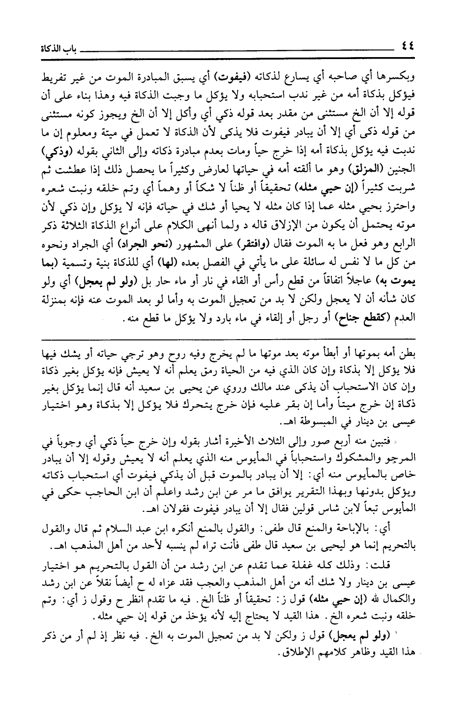 قلت: وذلك كله غفلة عما تقدم عن ابن رشد من أن القول بالتحريم هو اختيار عيسى بن دينار ولا شك أنه من أهل المذهب والعجب فقد عزاه له ح أيضًا نقلًا عن ابن رشد والكمال لله (إن حيي مثله) قول ز: تحقيقًا أو ظنًّا الخ. فيه ما تقدم انظر ح وقول ز أي: وتم خلقه ونبت شعره الخ. هذا القيد لا يحتاج إليه لأنه يؤخذ من قوله إن حيي مثله.