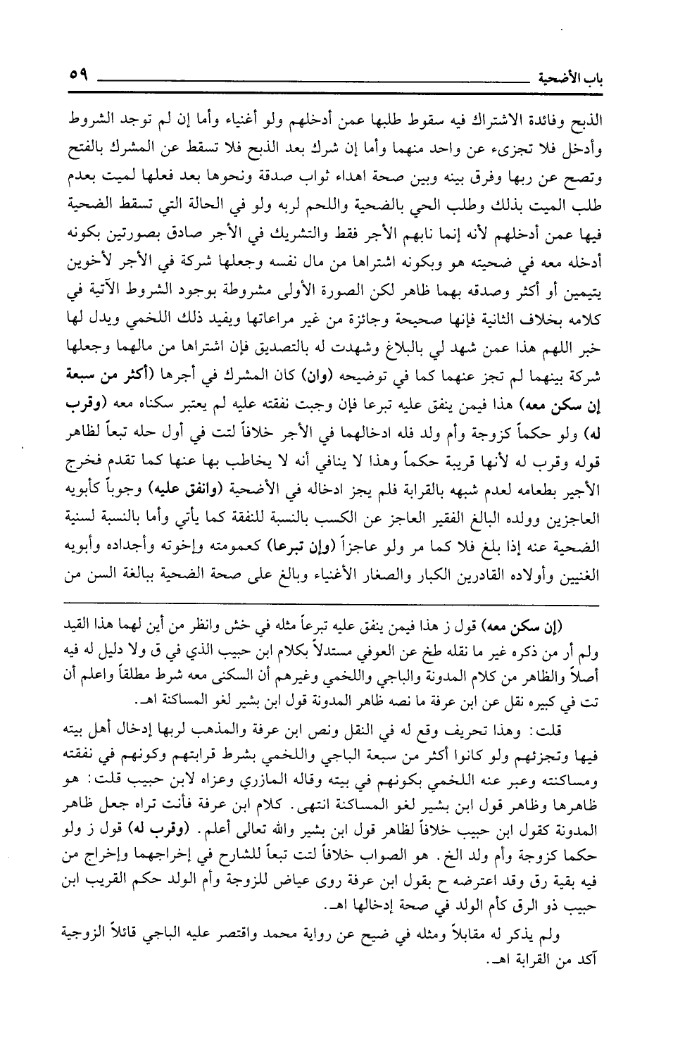 الذبح وفائدة الاشتراك فيه سقوط طلبها عمن أدخلهم ولو أغنياء وأما إن لم توجد الشروط وأدخل فلا تجزئ عن واحد منهما وأما إن شرك بعد الذبح فلا تسقط عن المشرك بالفتح وتصح عن ربها وفرق بينه وبين صحة إهداء ثواب صدقة ونحوها بعد فعلها لميت بعدم طلب الميت بذلك وطلب الحي بالضحية واللحم لربه ولو في الحالة التي تسقط الضحية فيها عمن أدخلهم لأنه إنما نابهم الأجر فقط والتشريك في الأجر صادق بصورتين بكونه أدخله معه في ضحيته هو وبكونه اشتراها من مال نفسه وجعلها شركة في الأجر لأخوين يتيمين أو أكثر وصدقه بهما ظاهر لكن الصورة الأولى مشروطة بوجود الشروط الآتية في كلامه بخلاف الثانية فإنها صحيحة وجائزة من غير مراعاتها ويفيد ذلك اللخمي ويدل لها خبر اللهم هذا عمن شهد لي بالبلاغ وشهدت له بالتصديق فإن اشتراها من مالهما وجعلها شركة بينهما لم تجز عنهما كما في توضيحه (وإن) كان المشرك في أجرها (أكثر من سبعة إن سكن معه) هذا فيمن ينفق عليه تبرعا فإن وجبت نفقته عليه لم يعتبر سكناه معه (وقرب له) ولو حكمًا كزوجة وأم ولد فله إدخالهما في الأجر خلافًا لتت في أول حله تبعًا لظاهر قوله وقرب له لأنها قريبة حكمًا وهذا لا ينافي أنه لا يخاطب بها عنها كما تقدم فخرج الأجير بطعامه لعدم شبهه بالقرابة فلم يجز إدخاله في الأضحية (واتفق عليه) وجوبًا كأبويه العاجزين وولده البالغ الفقير العاجز عن الكسب بالنسبة للنفقة كما يأتي وأما بالنسبة لسنية الضحية عنه إذا بلغ فلا كما مر ولو عاجزًا (وإن تبرعا) كعمومته وإخوته وأجداده وأبويه الغنيين وأولاده القادرين الكبار والصغار الأغنياء وبالغ على صحة الضحية ببالغة السنن من