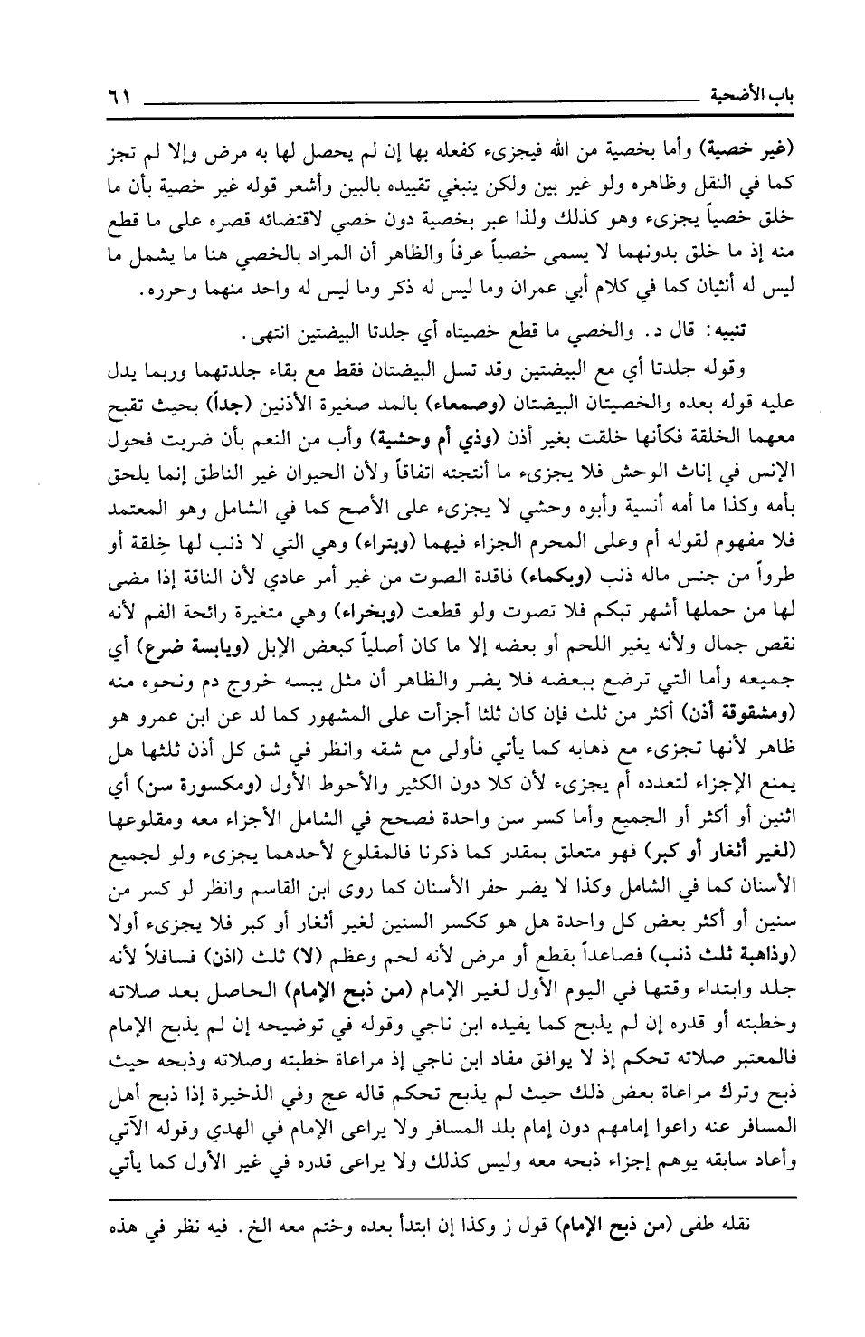 وقوله جلدتا أي مع البيضتين وقد تسل البيضتان فقط مع بقاء جلدتهما وربما يدل عليه قوله بعده والخصيتان البيضتان (وصمعاء) بالمد صغيرة الأذنين (جدًّا) بحيث تقبح معهما الخلقة فكأنها خلقت بغير أذن (وذي أم وحشية) وأب من النعم بأن ضربت فحول الإنس في إناث الوحش فلا يجزئ ما أنتجته اتفاقًا ولأن الحيوان غير الناطق إنما يلحق بأمه وكذا ما أمه أنسية وأبوه وحشي لا يجزئ على الأصح كما في الشامل وهو المعتمد فلا مفهوم لقوله أم وعلى المحرم الجزاء فيهما (وبتراء) وهي التي لا ذنب لها خِلقة أو طروًا من جنس ماله ذنب (وبكماء) فاقدة الصوت من غير أمر عادي لأن الناقة إذا مضى لها من حملها أشهر تبكم فلا تصوت ولو قطعت (وبخراء) وهي متغيرة رائحة الفم لأنه نقص جمال ولأنه يغير اللحم أو بعضه إلا ما كان أصليًّا كبعض الإبل (ويابسة ضرع) أي جميعه وأما التي ترضع ببعضه فلا يضر والظاهر أن مثل يبسه خروج دم ونحوه منه (ومشقوقة أذن) أكثر من ثلث فإن كان ثلثا أجزأت على المشهور كما لد عن ابن عمرو هو ظاهر لأنها تجزئ مع ذهابه كما يأتي فأولى مع شقه وانظر في شق كل أذن ثلثها هل يمنع الإجزاء لتعدده أم يجزئ لأن كلا دون الكثير والأحوط الأول (ومكسورة سن) أي اثنين أو أكثر أو الجميع وأما كسر سن واحدة فصحح في الشامل الإجزاء معه ومقلوعها (لغير أثغار أو كبر) فهو متعلق بمقدر كما ذكرنا فالمقلوع لأحدهما يجزئ ولو لجميع الأسنان كما في الشامل وكذا لا يضر حفر الأسنان كما روى ابن القاسم وانظر لو كسر من سنين أو أكثر بعض كل واحدة هل هو ككسر السنين لغير أثغار أو كبر فلا يجزئ أولا (وذاهبة ثلث ذنب) فصاعدًا بقطع أو مرض لأنه لحم وعظم (لا) ثلث (إذن) فسافلًا لأنه جلد وابتداء وقتها في اليوم الأول لغير الإمام (من ذبح الإمام) الحاصل بعد صلاته وخطبته أو قدره إن لم يذبح كما يفيده ابن ناجي وقوله في توضيحه إن لم يذبح الإمام فالمعتبر صلاته تحكم إذ لا يوافق مفاد ابن ناجي إذ مراعاة خطبته وصلاته وذبحه حيث ذبح وترك مراعاة بعض ذلك حيث لم يذبح تحكم قاله عج وفي الذخيرة إذا ذبح أهل المسافر عنه راعوا إمامهم دون إمام بلد المسافر ولا يراعى الإمام في الهدي وقوله الآتي وأعاد سابقه يوهم إجزاء ذبحه معه وليس كذلك ولا يراعى قدره في غير الأول كما يأتي