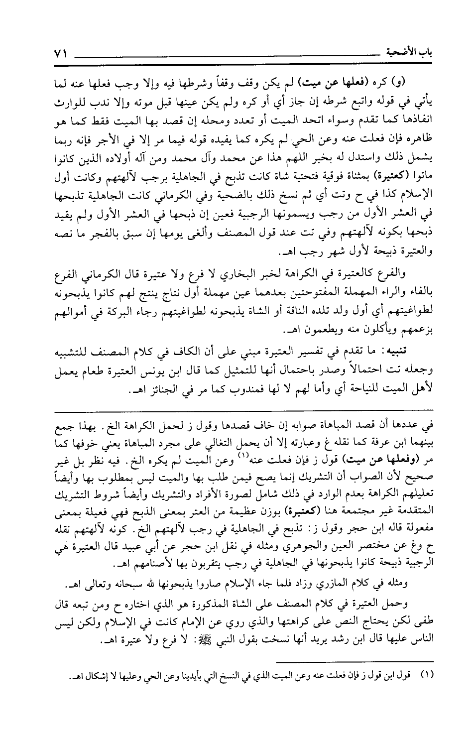 في عددها أن قصد المباهاة صوابه إن خاف قصدها وقول ز لحمل الكراهة الخ. بهذا جمع بينهما ابن عرفة كما نقله غ وعبارته إلا أن يحمل التغالي على مجرد المباهاة يعني خوفها كما مر (وفعلها عن ميت) قول ز فإن فعلت عنه (¬1) وعن الميت لم يكره الخ. فيه نظر بل غير صحيح لأن الصواب أن التشريك إنما يصح فيمن طلب بها والميت ليس بمطلوب بها وأيضًا تعليلهم الكراهة بعدم الوارد في ذلك شامل لصورة الأفراد والتشريك وأيضًا شروط التشريك المتقدمة غير مجتمعة هنا (كعتيرة) بوزن عظيمة من العتر بمعنى الذبح فهي فعيلة بمعنى مفعولة قاله ابن حجر وقول ز: تذبح في الجاهلية في رجب لآلهتهم الخ. كونه لآلهتهم نقله ح وغ عن مختصر العين والجوهري ومثله في نقل ابن حجر عن أبي عبيد قال العتيرة هي الرجبية ذبيحة كانوا يذبحونها في الجاهلية في رجب يتقربون بها لأصنامهم اهـ.