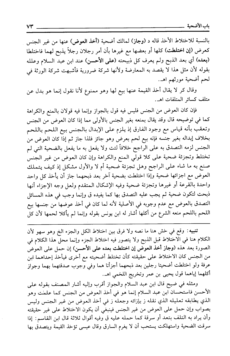 بالنسبة للاختلاط الأخذ قاله د (وجاز) لمالك أضحية (أخذ العوض) عنها من غير الجنس كعرض (إن اختلطت) كلها أو بعضها مع غيرها بأن أمر رجلان رجلًا يذح لهما فاختلطا (بعده) أي بعد الذبح ولم يعرف كل ذبيحته (على الأحسن) عند ابن عبد السلام وعلله بقوله لأن مثل هذا لا يقصد به المعارضة ولأنها شركة ضرورية فأشبهت شركة الورثة في لحم أضحية مورثهم اهـ.
