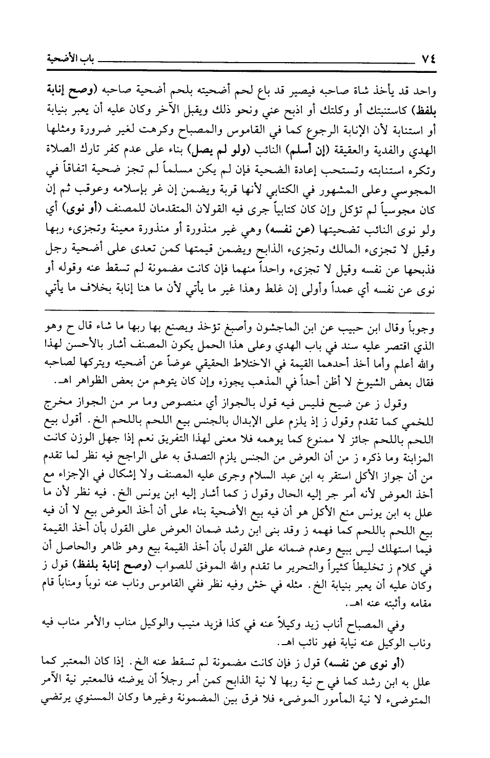 واحد قد يأخذ شاة صاحبه فيصير قد باع لحم أضحيته بلحم أضحية صاحبه (وصح إنابة بلفظ) كاستنبتك أو وكلتك أو اذبح عني ونحو ذلك ويقبل الآخر وكان عليه أن يعبر بنيابة أو استنابة لأن الإنابة الرجوع كما في القاموس والمصباح وكرهت لغير ضرورة ومثلها الهدي والفدية والعقيقة (إن أسلم) النائب (ولو لم يصل) بناء على عدم كفر تارك الصلاة وتكره استنابته وتستحب إعادة الضحية فإن لم يكن مسلمًا لم تجز ضحية اتفاقًا في المجوسي وعلى المشهور في الكتابي لأنها قربة ويضمن إن غر بإسلامه وعوقب ثم إن كان مجوسيًّا لم تؤكل وإن كان كتابيًّا جرى فيه القولان المتقدمان للمصنف (أو نوى) أي ولو نوى النائب تضحيتها (عن نفسه) وهي غير منذورة أو منذورة معينة وتجزىء ربها وقيل لا تجزئ المالك وتجزىء الذابح ويضمن قيمتها كمن تعدى على أضحية رجل فذبحها عن نفسه وقيل لا تجزئ واحدًا منهما فإن كانت مضمونة لم تسقط عنه وقوله أو نوى عن نفسه أي عمدًا وأولى إن غلط وهذا غير ما يأتي لأن ما هنا إنابة بخلاف ما يأتي