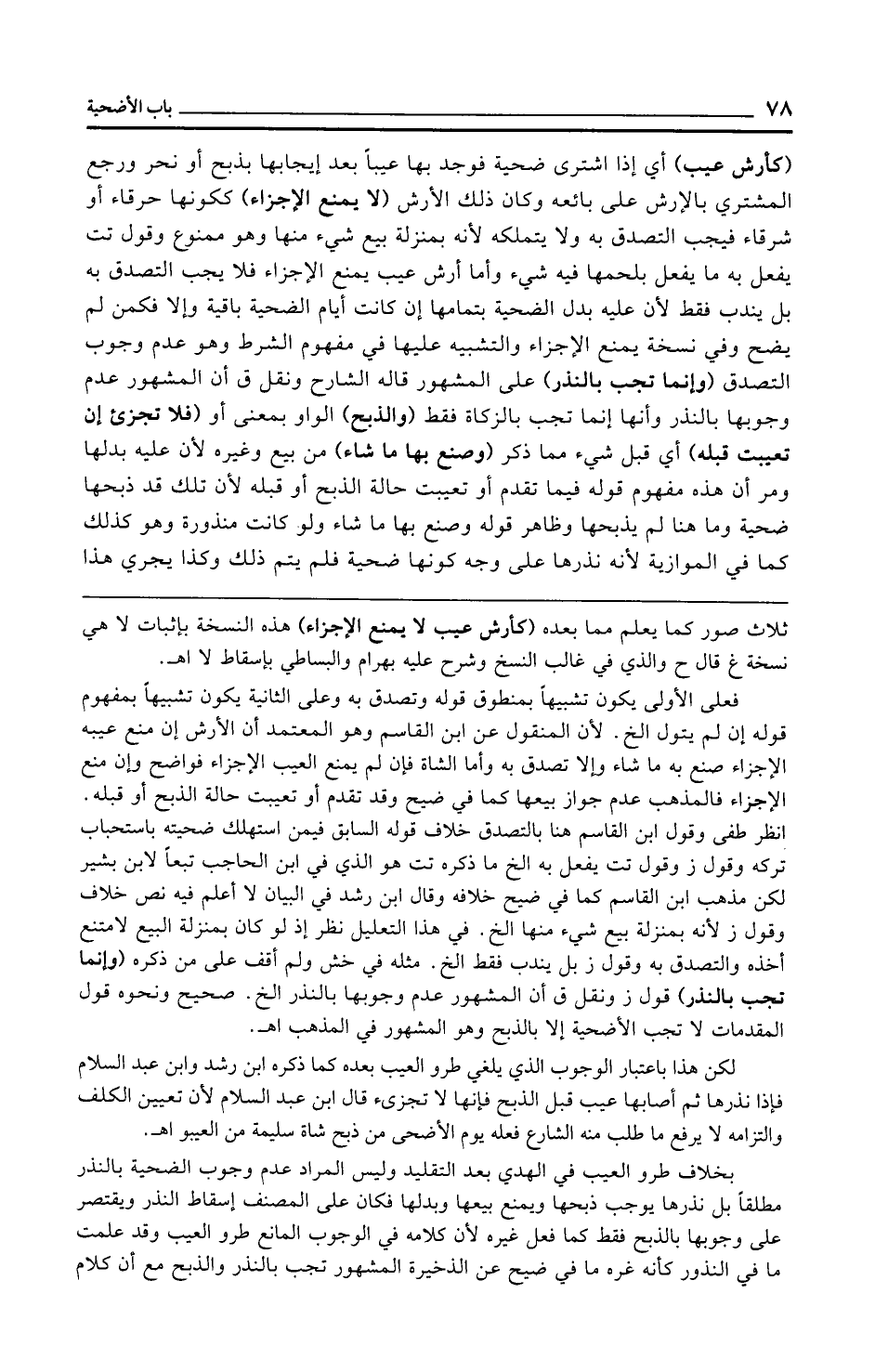 لكن هذا باعتبار الوجوب الذي يلغي طرو العيب بعده كما ذكره ابن رشد وابن عبد السلام فإذا نذرها ثم أصابها عيب قبل الذبح فإنها لا تجزئ قال ابن عبد السلام لأن تعيين الكلف والتزامه لا يرفع ما طلب منه الشارع فعله يوم الأضحى من ذبح شاة سليمة من العيوب اهـ.