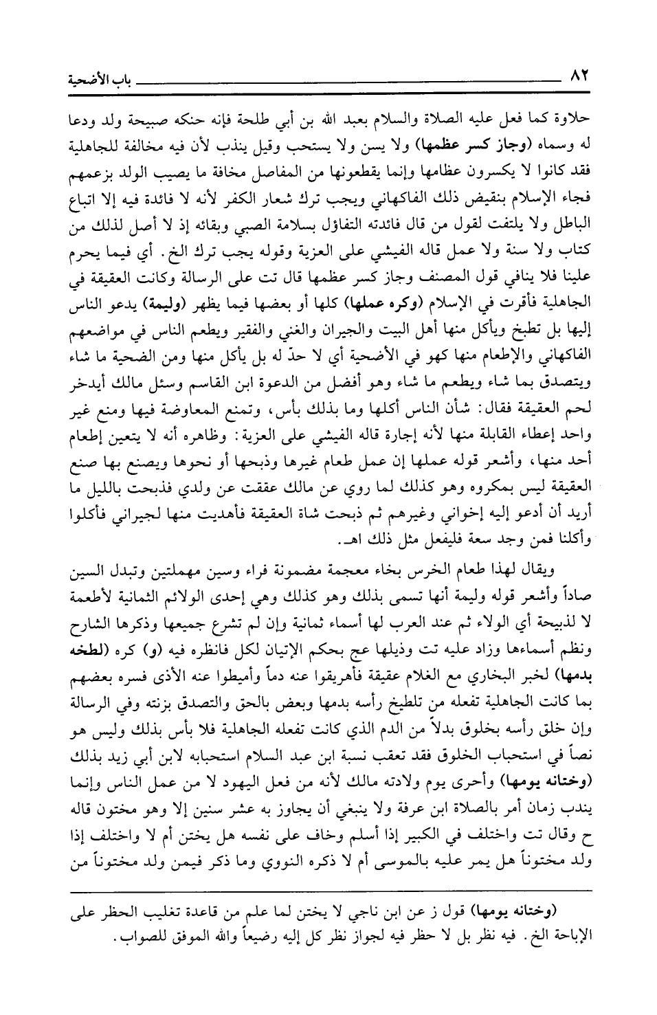 حلاوة كما فعل عليه الصلاة والسلام بعبد الله بن أبي طلحة فإنه حنكه صبيحة ولد ودعا له وسماه (وجاز كسر عظمها) ولا يسن ولا يستحب وقيل ينذب لأن فيه مخالفة للجاهلية فقد كانوا لا يكسرون عظامها وإنما يقطعونها من المفاصل مخافة ما يصيب الولد بزعمهم فجاء الإسلام بنقيض ذلك الفاكهاني ويجب ترك شعار الكفر لأنه لا فائدة فيه إلا اتباع الباطل ولا يلتفت لقول من قال فائدته التفاؤل بسلامة الصبي وبقائه إذ لا أصل لذلك من كتاب ولا سنة ولا عمل قاله الفيشي على العزية وقوله يجب ترك الخ. أي فيما يحرم علينا فلا ينافي قول المصنف وجاز كسر عظمها قال تت على الرسالة وكانت العقيقة في الجاهلية فأقرت في الإسلام (وكره عملها) كلها أو بعضها فيما يظهر (وليمة) يدعو الناس إليها بل تطبخ ويأكل منها أهل البيت والجيران والغني والفقير ويطعم الناس في مواضعهم الفاكهاني والإطعام منها كهو في الأضحية أي لا حدّ له بل يأكل منها ومن الضحية ما شاء ويتصدق بما شاء ويطعم ما شاء وهو أفضل من الدعوة ابن القاسم وسئل مالك أيدخر لحم العقيقة فقال: شأن الناس أكلها وما بذلك بأس، وتمنع المعاوضة فيها ومنع غير واحد إعطاء القابلة منها لأنه إجارة قاله الفيشي على العزية: وظاهره أنه لا يتعين إطعام أحد منها، وأشعر قوله عملها إن عمل طعام غيرها وذبحها أو نحوها ويصنع بها صنع العقيقة ليس بمكروه وهو كذلك لما روي عن مالك عققت عن ولدي فذبحت بالليل ما أريد أن أدعو إليه إخواني وغيرهم ثم ذبحت شاة العقيقة فأهديت منها لجيراني فأكلوا وأكلنا فمن وجد سعة فليفعل مثل ذلك اهـ.