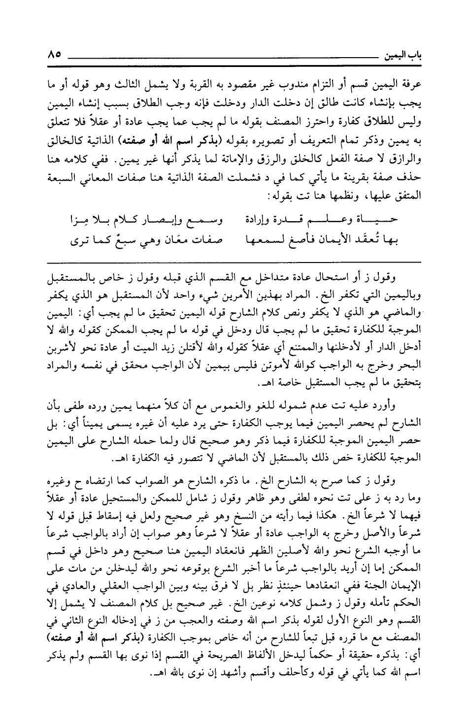 عرفة اليمين قسم أو التزام مندوب غير مقصود به القربة ولا يشمل الثالث وهو قوله أو ما يجب بإنشاء كانت طالق إن دخلت الدار ودخلت فإنه وجب الطلاق بسبب إنشاء اليمين وليس للطلاق كفارة واحترز المصنف بقوله ما لم يجب عما يجب عادة أو عقلًا فلا تتعلق به يمين وذكر تمام التعريف أو تصويره بقوله (بذكر اسم الله أو صفته) الذاتية كالخالق والرازق لا صفة الفعل كالخلق والرزق والإماتة لما يذكر أنها غير يمين. ففي كلامه هنا حذف صفة بقرينة ما يأتي كما في د فشملت الصفة الذاتية هنا صفات المعاني السبعة المتفق عليها، ونظمها هنا تت بقوله: