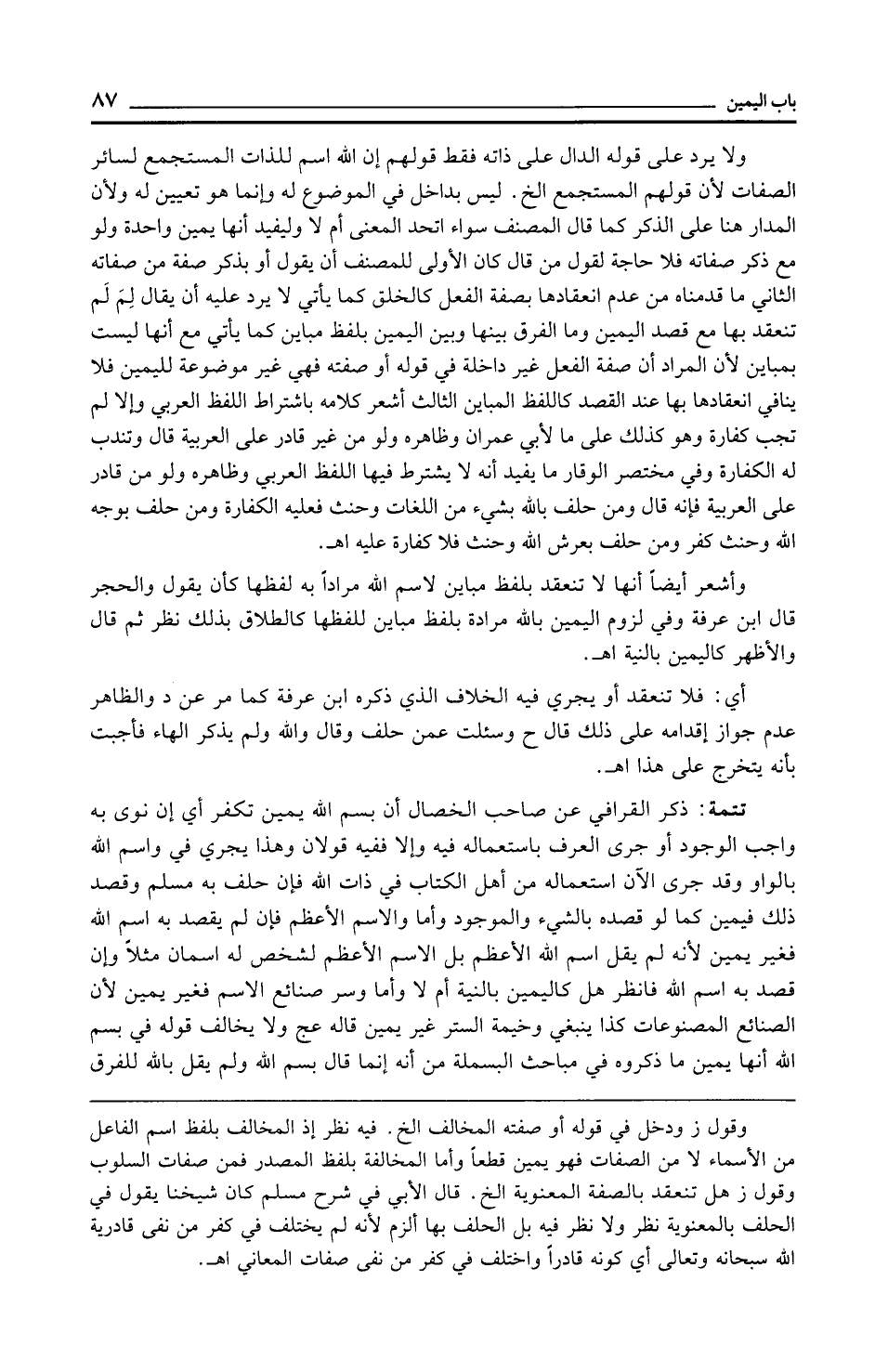 ولا يرد على قوله الدال على ذاته فقط قولهم إن الله اسم للذات المستجمع لسائر الصفات لأن قولهم المستجمع الخ. ليس بداخل في الموضوع له وإنما هو تعيين له ولأن المدار هنا على الذكر كما قال المصنف سواء اتحد المعنى أم لا وليفيد أنها يمين واحدة ولو مع ذكر صفاته فلا حاجة لقول من قال كان الأولى للمصنف أن يقول أو بذكر صفة من صفاته الثاني ما قدمناه من عدم انعقادها بصفة الفعل كالخلق كما يأتي لا يرد عليه أن يقال لِمَ لَم تنعقد بها مع قصد اليمين وما الفرق بينها وبين اليمين بلفظ مباين كما يأتي مع أنها ليست بمباين لأن المراد أن صفة الفعل غير داخلة في قوله أو صفته فهي غير موضوعة لليمين فلا ينافي انعقادها بها عند القصد كاللفظ المباين الثالث أشعر كلامه باشتراط اللفظ العربي وإلا لم تجب كفارة وهو كذلك على ما لأبي عمران وظاهره ولو من غير قادر على العربية قال وتندب له الكفارة وفي مختصر الوقار ما يفيد أنه لا يشترط فيها اللفظ العربي وظاهره ولو من قادر على العربية فإنه قال ومن حلف بالله بشيء من اللغات وحنث فعليه الكفارة ومن حلف بوجه الله وحنث كفر ومن حلف بعرش الله وحنث فلا كفارة عليه اهـ.