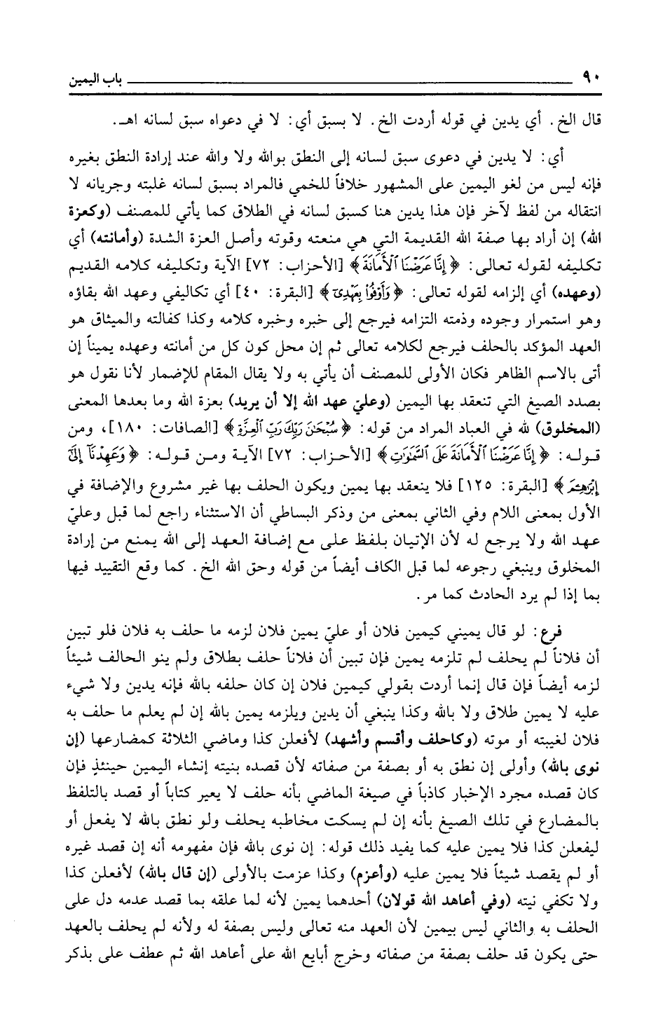 أي: لا يدين في دعوى سبق لسانه إلى النطق بوالله ولا والله عند إرادة النطق بغيره فإنه ليس من لغو اليمين على المشهور خلافًا للخمي فالمراد بسبق لسانه غلبته وجريانه لا انتقاله من لفظ لآخر فإن هذا يدين هنا كسبق لسانه في الطلاق كما يأتي للمصنف (وكعزة الله) إن أراد بها صفة الله القديمة التي هي منعته وقوته وأصل العزة الشدة (وأمانته) أي تكليفه لقوله تعالى: {إِنَّا عَرَضْنَا الْأَمَانَةَ} [الأحزاب: 72] الآية وتكليفه كلامه القديم (وعهده) أي إلزامه لقوله تعالى: {وَأَوْفُوا بِعَهْدِي} [البقرة: 40] أي تكاليفي وعهد الله بقاؤه وهو استمرار وجوده وذمته التزامه فيرجع إلى خبره وخبره كلامه وكذا كفالته والميثاق هو العهد المؤكد بالحلف فيرجع لكلامه تعالى ثم إن محل كون كل من أمانته وعهده يمينًا إن أتى بالاسم الظاهر فكان الأولى للمصنف أن يأتي به ولا يقال المقام للإضمار لأنا نقول هو بصدد الصيغ التي تنعقد بها اليمين (وعليّ عهد الله إلا أن يريد) بعزة الله وما بعدها المعنى (المخلوق) لله في العباد المراد من قوله: {سُبْحَانَ رَبِّكَ رَبِّ الْعِزَّةِ} [الصافات: 180]، ومن قوله: {إِنَّا عَرَضْنَا الْأَمَانَةَ عَلَى السَّمَاوَاتِ} [الأحزاب: 72] الآية ومن قوله: {وَعَهِدْنَا إِلَى إِبْرَاهِيمَ} [البقرة: 125] فلا ينعقد بها يمين ويكون الحلف بها غير مشروع والإضافة في الأول بمعنى اللام وفي الثاني بمعنى من وذكر البساطي أن الاستثناء راجع لما قبل وعليّ عهد الله ولا يرجع له لأن الإتيان بلفظ على مع إضافة العهد إلى الله يمنع من إرادة المخلوق وينبغي رجوعه لما قبل الكاف أيضًا من قوله وحق الله الخ. كما وقع التقييد فيها بما إذا لم يرد الحادث كما مر.