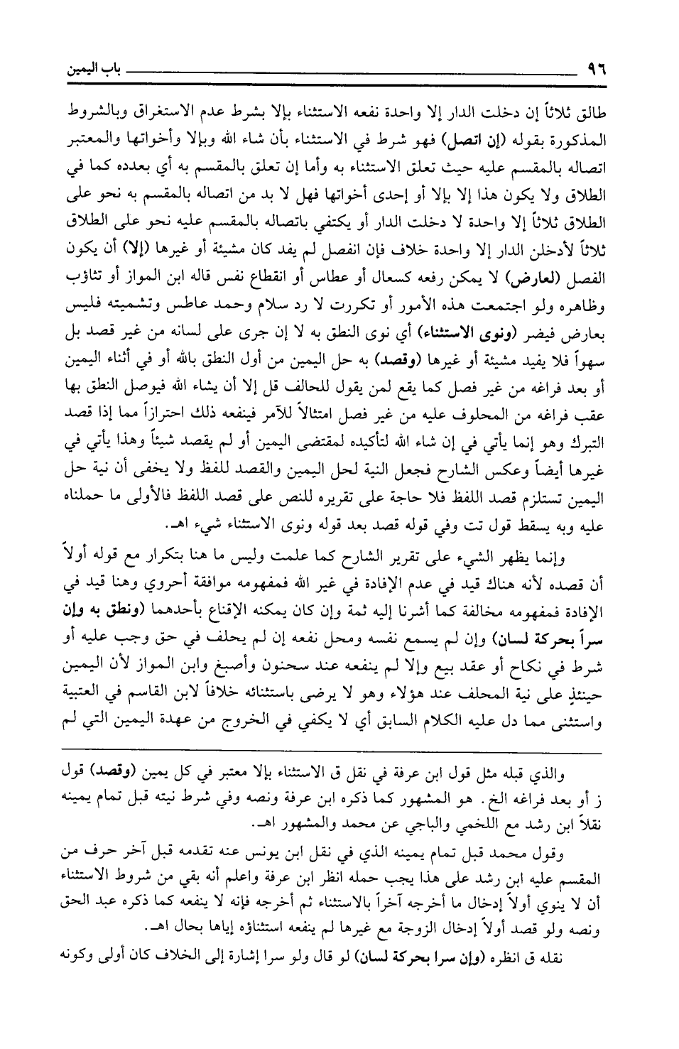وقول محمد قبل تمام يمينه الذي في نقل ابن يونس عنه تقدمه قبل آخر حرف من المقسم عليه ابن رشد على هذا يجب حمله انظر ابن عرفة واعلم أنه بقي من شروط الاستثناء أن لا ينوي أولًا إدخال ما أخرجه آخرًا بالاستثناء ثم أخرجه فإنه لا ينفعه كما ذكره عبد الحق ونصه ولو قصد أولًا إدخال الزوجة مع غيرها لم ينفعه استثناؤه إياها بحال اهـ.