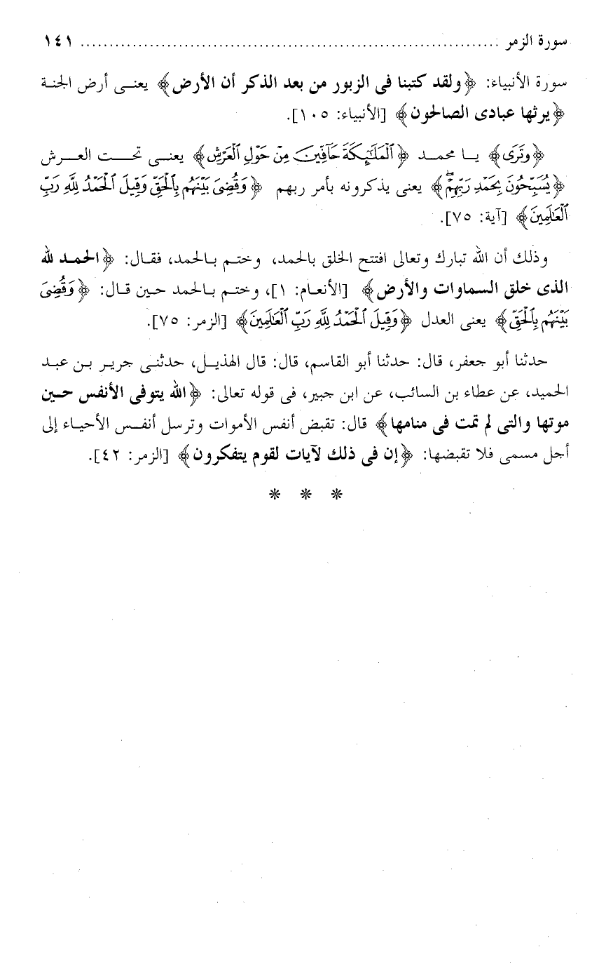 وذلك أن الله تبارك وتعالى افتتح الخلق بالحمد ، وختم بالحمد ، فقال : ( الحمد لله الذي خلق السماوات والأرض ) [ الأنعام : 1 ] ، وختم بالحمد حين قال : ( وقضي بينهم بالحق ( يعني العدل ) وقيل الحمد لله رب العالمين ) [ الزمر : 75 ] .