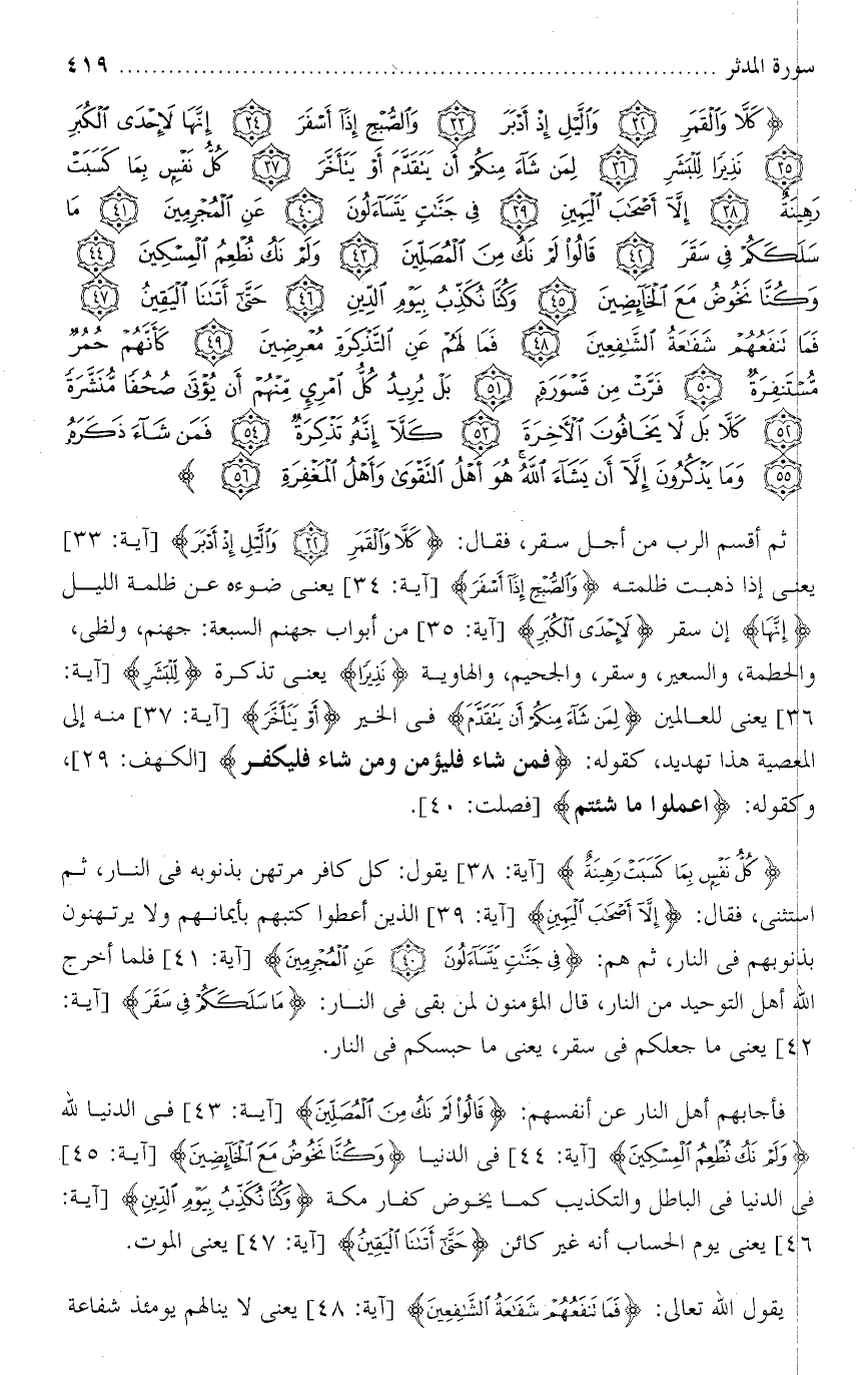 تفسير سورة المدثر من الآية ( 32 ) إلى الآية ( 56 ) .