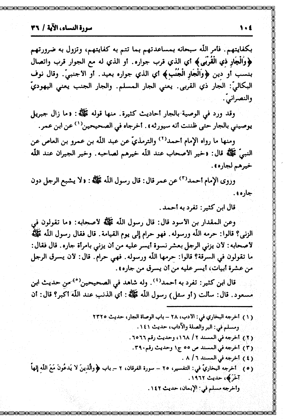 بكفايتهم. فأمر الله سبحانه بمساعدتهم بما تتم به كفايتهم، وتزول به ضرورتهم وَالْجارِ ذِي الْقُرْبى أي الذي قرب جواره. أو الذي له مع الجوار قرب واتصال بنسب أو دين وَالْجارِ الْجُنُبِ أي الذي جواره بعيد. أو الأجنبيّ. وقال نوف البكاليّ: الجار ذي القربى. يعني الجار المسلم. والجار الجنب يعني اليهوديّ والنصرانيّ.