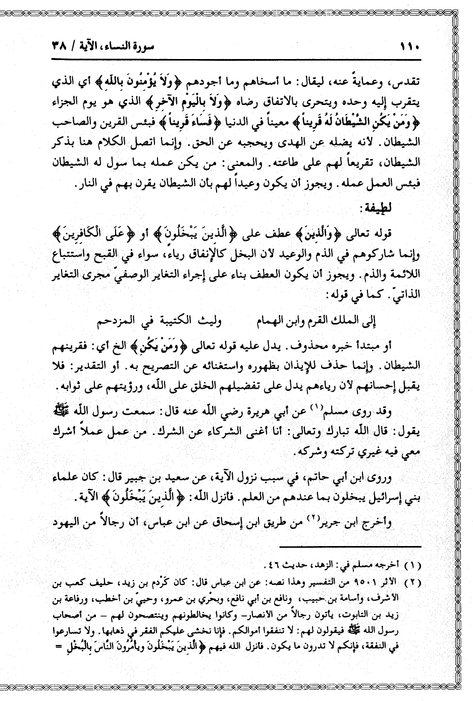 (2) الأثر 9501 من التفسير وهذا نصه: عن ابن عباس قال: كان كردم بن زيد، حليف كعب بن الأشرف، وأسامة بن حبيب، ونافع بن أبي نافع، وبحري بن عمرو، وحييّ بن أخطب، ورفاعة بن زيد بن التابوت، يأتون رجالا من الأنصار- وكانوا يخالطونهم وينتصحون لهم- من أصحاب رسول الله صلى الله عليه وسلم فيقولون لهم: لا تنفقوا أموالكم. فإنا نخشى عليكم الفقر في ذهابها. ولا تسارعوا في النفقة، فإنكم لا تدرون ما يكون. فأنزل الله فيهم الَّذِينَ يَبْخَلُونَ وَيَأْمُرُونَ النَّاسَ بِالْبُخْلِ