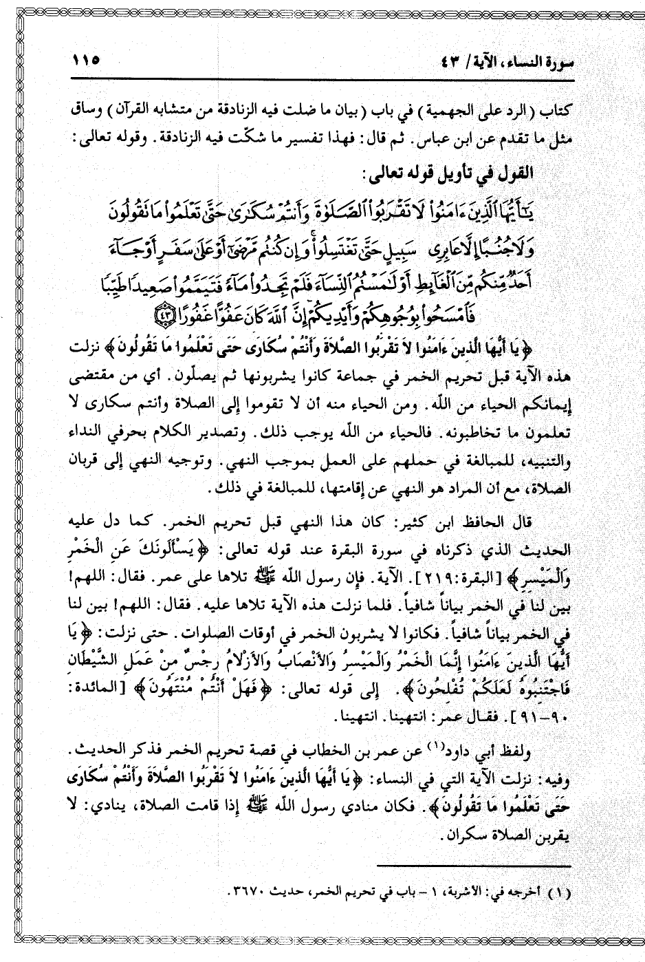 يا أَيُّهَا الَّذِينَ آمَنُوا لا تَقْرَبُوا الصَّلاةَ وَأَنْتُمْ سُكارى حَتَّى تَعْلَمُوا ما تَقُولُونَ وَلا جُنُباً إِلاَّ عابِرِي سَبِيلٍ حَتَّى تَغْتَسِلُوا وَإِنْ كُنْتُمْ مَرْضى أَوْ عَلى سَفَرٍ أَوْ جاءَ أَحَدٌ مِنْكُمْ مِنَ الْغائِطِ أَوْ لامَسْتُمُ النِّساءَ فَلَمْ تَجِدُوا ماءً فَتَيَمَّمُوا صَعِيداً طَيِّباً فَامْسَحُوا بِوُجُوهِكُمْ وَأَيْدِيكُمْ إِنَّ اللَّهَ كانَ عَفُوًّا غَفُوراً (43)