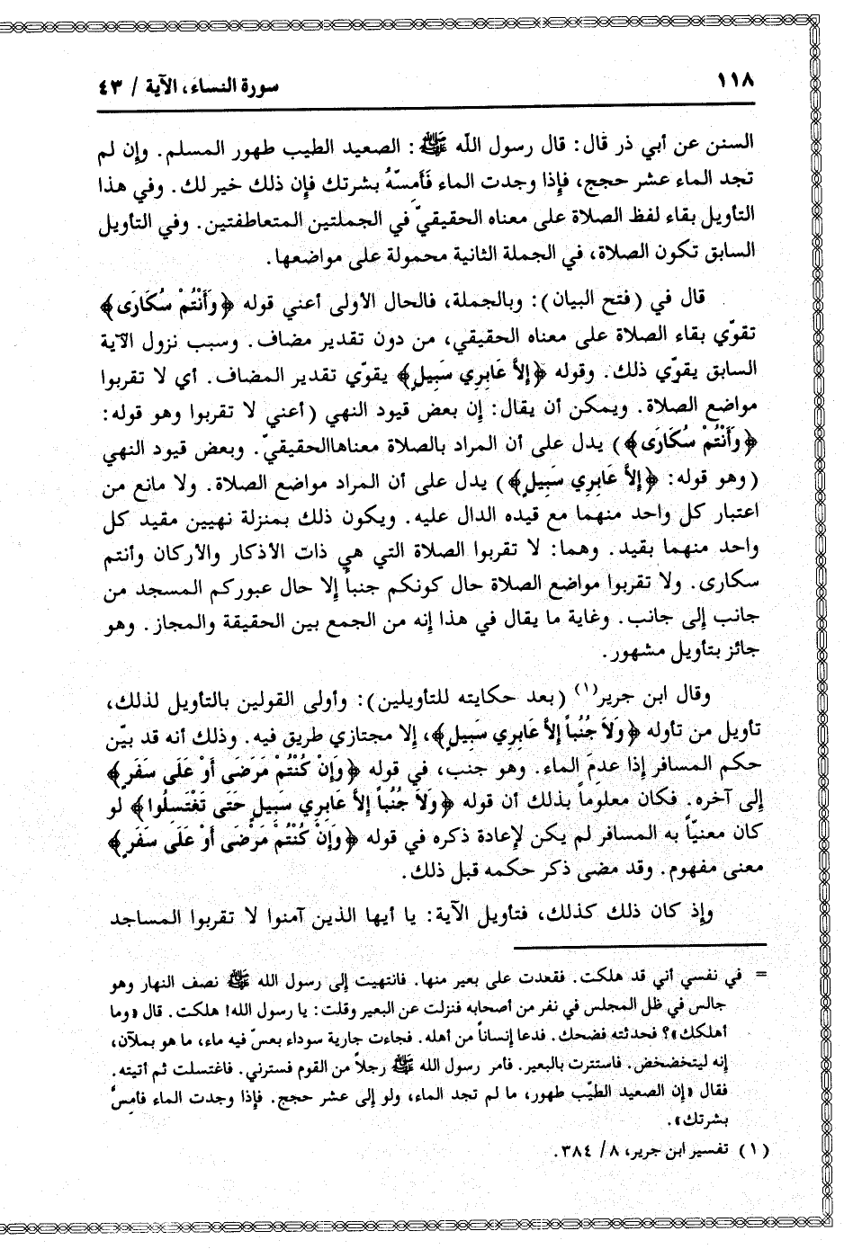 وقال ابن جرير «1» (بعد حكايته للتأويلين) : وأولى القولين بالتأويل لذلك، تأويل من تأوله وَلا جُنُباً إِلَّا عابِرِي سَبِيلٍ، إلا مجتازي طريق فيه. وذلك أنه قد بيّن حكم المسافر إذا عدم الماء. وهو جنب، في قوله وَإِنْ كُنْتُمْ مَرْضى أَوْ عَلى سَفَرٍ إلى آخره. فكان معلوما بذلك أن قوله وَلا جُنُباً إِلَّا عابِرِي سَبِيلٍ حَتَّى تَغْتَسِلُوا لو كان معنيّا به المسافر لم يكن لإعادة ذكره في قوله وَإِنْ كُنْتُمْ مَرْضى أَوْ عَلى سَفَرٍ معنى مفهوم. وقد مضى ذكر حكمه قبل ذلك.