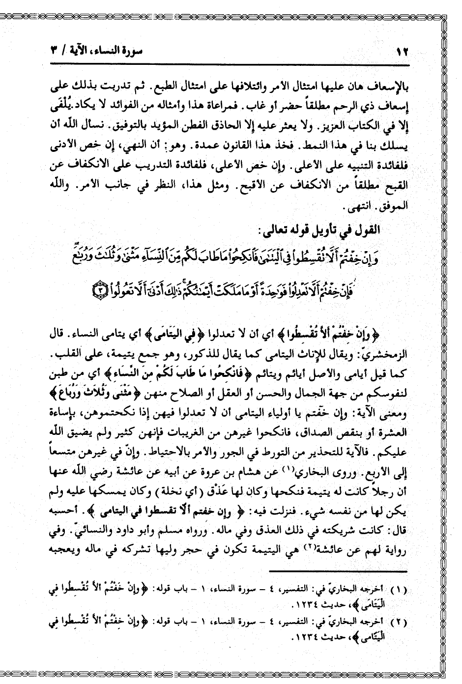 (2) أخرجه البخاريّ في: التفسير، 4- سورة النساء، 1- باب قوله: وَإِنْ خِفْتُمْ أَلَّا تُقْسِطُوا فِي الْيَتامى، حديث 1234.