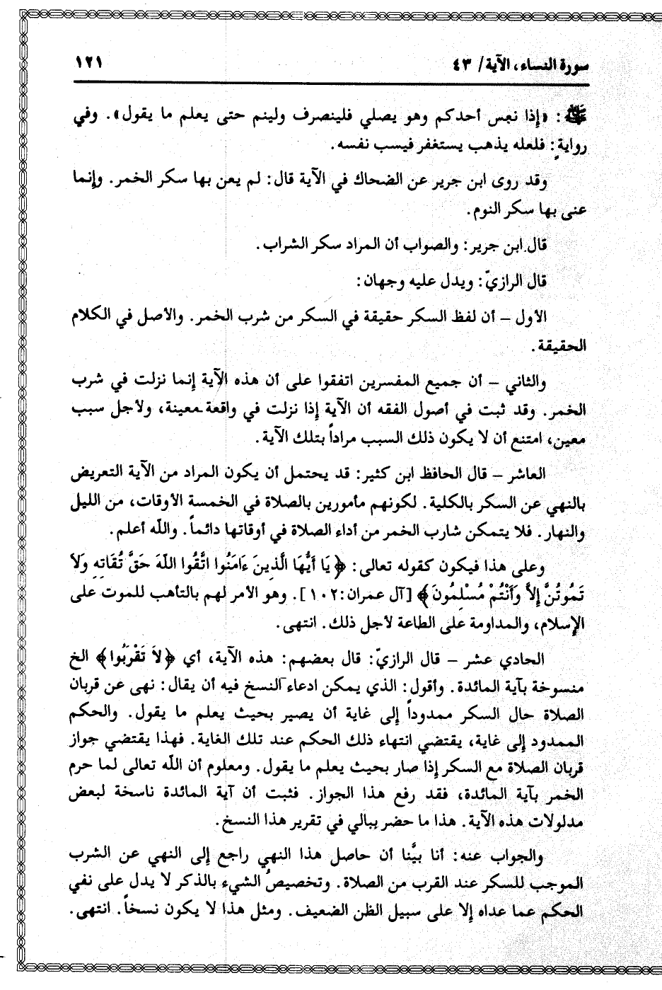 العاشر- قال الحافظ ابن كثير: قد يحتمل أن يكون المراد من الآية التعريض بالنهي عن السكر بالكلية. لكونهم مأمورين بالصلاة في الخمسة الأوقات، من الليل والنهار. فلا يتمكن شارب الخمر من أداء الصلاة في أوقاتها دائما. والله أعلم.