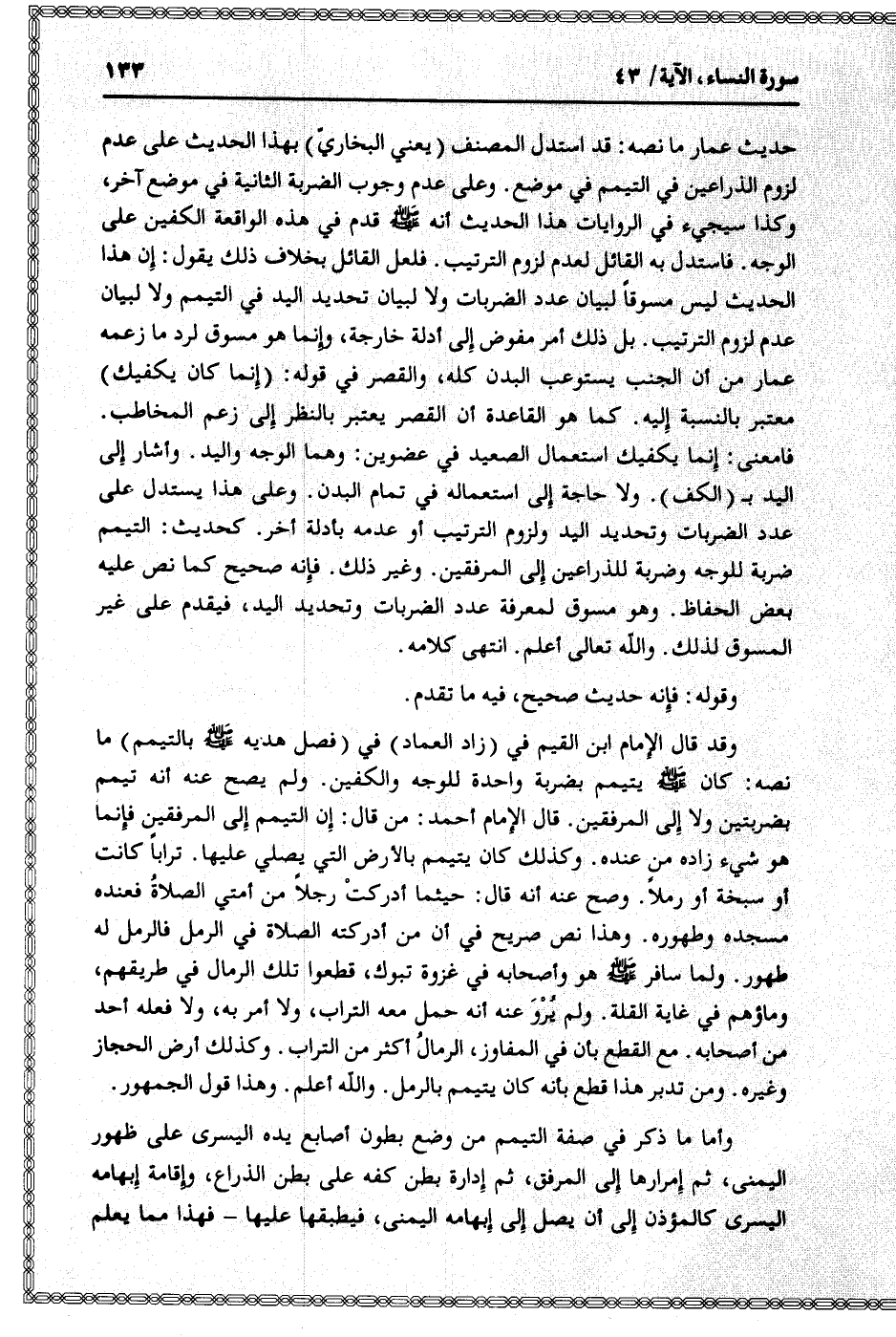فالمعنى: إنما يكفيك استعمال الصعيد في عضوين: وهما الوجه واليد. وأشار إلى اليد ب (الكف) . ولا حاجة إلى استعماله في تمام البدن. وعلى هذا يستدل على عدد الضربات وتحديد اليد ولزوم الترتيب أو عدمه بأدلة أخر. كحديث: التيمم ضربة للوجه وضربة للذراعين إلى المرفقين. وغير ذلك. فإنه صحيح كما نص عليه بعض الحفاظ. وهو مسوق لمعرفة عدد الضربات وتحديد اليد، فيقدم على غير المسوق لذلك. والله تعالى أعلم. انتهى كلامه.