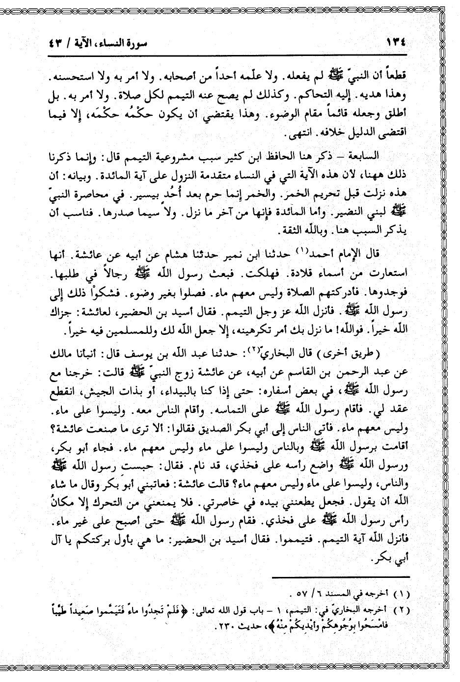 (2) أخرجه البخاريّ في: التيمم، 1- باب قول الله تعالى: فَلَمْ تَجِدُوا ماءً فَتَيَمَّمُوا صَعِيداً طَيِّباً فَامْسَحُوا بِوُجُوهِكُمْ وَأَيْدِيكُمْ مِنْهُ، حديث 230.