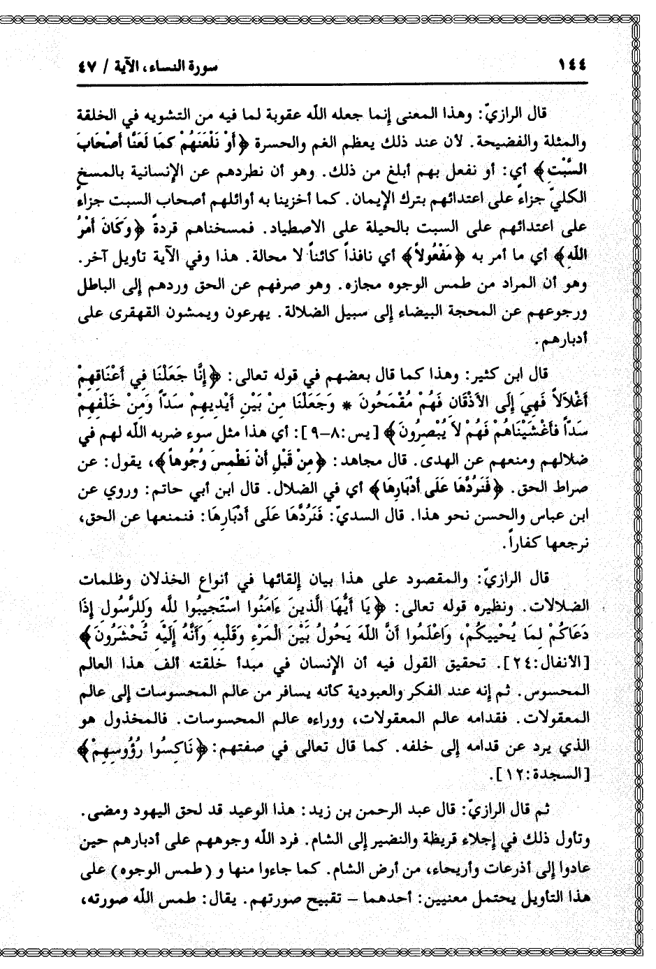 قال ابن كثير: وهذا كما قال بعضهم في قوله تعالى: إِنَّا جَعَلْنا فِي أَعْناقِهِمْ أَغْلالًا فَهِيَ إِلَى الْأَذْقانِ فَهُمْ مُقْمَحُونَ وَجَعَلْنا مِنْ بَيْنِ أَيْدِيهِمْ سَدًّا وَمِنْ خَلْفِهِمْ سَدًّا فَأَغْشَيْناهُمْ فَهُمْ لا يُبْصِرُونَ [يس: 8- 9] : أي هذا مثل سوء ضربه الله لهم في ضلالهم ومنعهم عن الهدى. قال مجاهد: مِنْ قَبْلِ أَنْ نَطْمِسَ وُجُوهاً، يقول: عن صراط الحق. فَنَرُدَّها عَلى أَدْبارِها أي في الضلال. قال ابن أبي حاتم: وروي عن ابن عباس والحسن نحو هذا. قال السديّ: فنردّها على أدبارها: فنمنعها عن الحق، نرجعها كفارا.