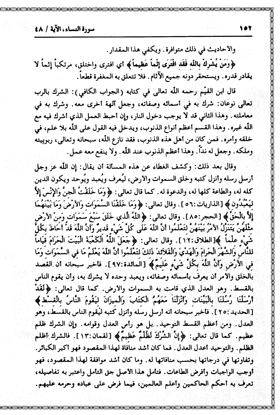وقال بعد ذلك: وكشف الغطاء عن هذه المسألة أن يقال: إن الله عز وجل أرسل رسله وأنزل كتبه وخلق السموات والأرض، ليعرف ويعبد ويوحد ويكون الدين كله له، والطاعة كلها له، والدعوة له. كما قال تعالى: وَما خَلَقْتُ الْجِنَّ وَالْإِنْسَ إِلَّا لِيَعْبُدُونِ [الذاريات: 56] . وقال تعالى: وَما خَلَقْنَا السَّماواتِ وَالْأَرْضَ وَما بَيْنَهُما إِلَّا بِالْحَقِّ [الحجر: 85] . وقال تعالى: اللَّهُ الَّذِي خَلَقَ سَبْعَ سَماواتٍ وَمِنَ الْأَرْضِ مِثْلَهُنَّ يَتَنَزَّلُ الْأَمْرُ بَيْنَهُنَّ لِتَعْلَمُوا أَنَّ اللَّهَ عَلى كُلِّ شَيْءٍ قَدِيرٌ وَأَنَّ اللَّهَ قَدْ أَحاطَ بِكُلِّ شَيْءٍ عِلْماً [الطلاق: 12] . وقال تعالى: جَعَلَ اللَّهُ الْكَعْبَةَ الْبَيْتَ الْحَرامَ قِياماً لِلنَّاسِ وَالشَّهْرَ الْحَرامَ وَالْهَدْيَ وَالْقَلائِدَ ذلِكَ لِتَعْلَمُوا أَنَّ اللَّهَ يَعْلَمُ ما فِي السَّماواتِ وَما فِي الْأَرْضِ وَأَنَّ اللَّهَ بِكُلِّ شَيْءٍ عَلِيمٌ [المائدة: 97] . فأخبر سبحانه أن القصد بالخلق والأمر أن يعرف بأسمائه وصفاته، ويعبد وحده لا يشرك به، وأن يقوم الناس بالقسط. وهو العدل الذي قامت به السموات والأرض. كما قال تعالى: لَقَدْ أَرْسَلْنا رُسُلَنا بِالْبَيِّناتِ وَأَنْزَلْنا مَعَهُمُ الْكِتابَ وَالْمِيزانَ لِيَقُومَ النَّاسُ بِالْقِسْطِ [الحديد: 25] . فأخبر سبحانه أنه أرسل رسله وأنزل كتبه ليقوم الناس بالقسط، وهو العدل. ومن أعظم القسط التوحيد. بل هو رأس العدل وقوامه. وإن الشرك ظلم عظيم. كما قال تعالى: إِنَّ الشِّرْكَ لَظُلْمٌ عَظِيمٌ [لقمان: 13] . فالشرك أظلم الظلم. والتوحيد أعدل العدل. فما كان أشد منافاة لهذا المقصود فهو أكبر الكبائر.