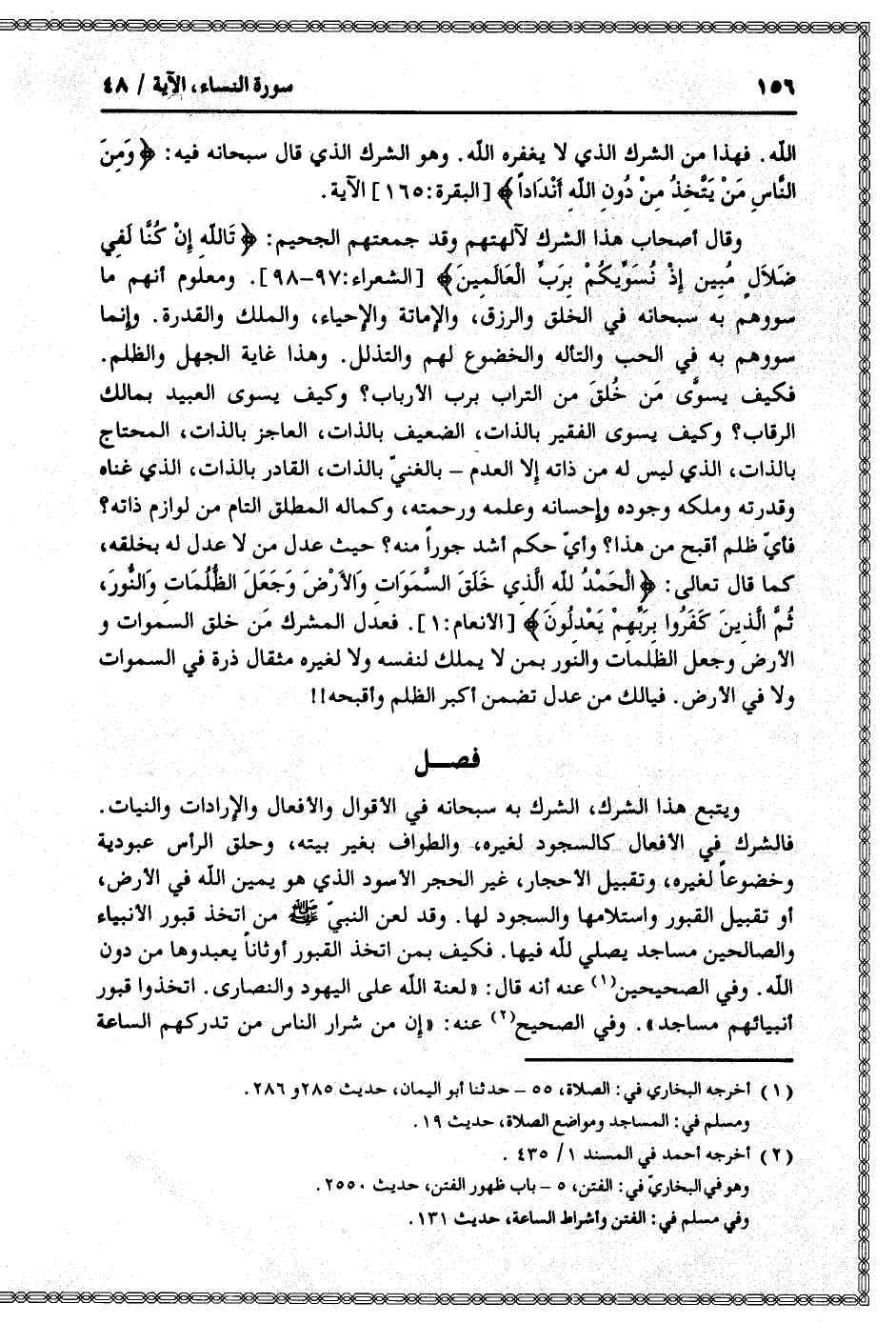 فكيف يسوّى من خلق من التراب برب الأرباب؟ وكيف يسوى العبيد بمالك الرقاب؟ وكيف يسوى الفقير بالذات، الضعيف بالذات، العاجز بالذات، المحتاج بالذات، الذي ليس له من ذاته إلا العدم- بالغنيّ بالذات، القادر بالذات، الذي غناه وقدرته وملكه وجوده وإحسانه وعلمه ورحمته، وكماله المطلق التام من لوازم ذاته؟