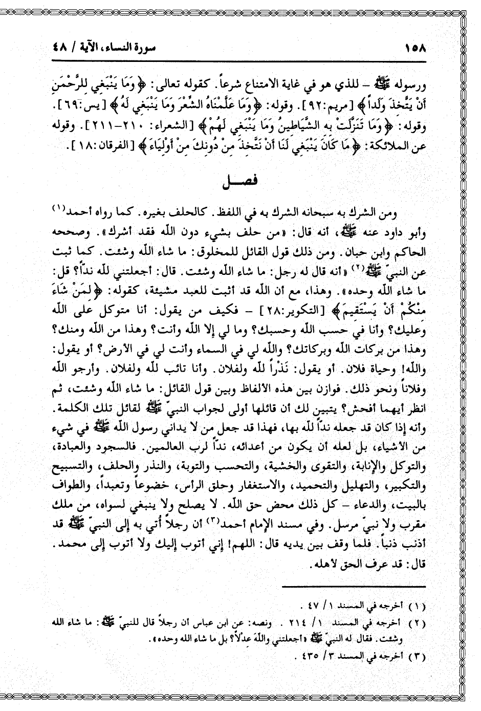 وأنه إذا كان قد جعله ندّا لله بها، فهذا قد جعل من لا يداني رسول الله صلى الله عليه وسلم في شيء من الأشياء، بل لعله أن يكون من أعدائه، ندّا لرب العالمين. فالسجود والعبادة، والتوكل والإنابة، والتقوى والخشية، والتحسب والتوبة، والنذر والحلف، والتسبيح والتكبير، والتهليل والتحميد، والاستغفار وحلق الرأس، خضوعا وتعبدا، والطواف بالبيت، والدعاء- كل ذلك محض حق الله. لا يصلح ولا ينبغي لسواه، من ملك مقرب ولا نبيّ مرسل.