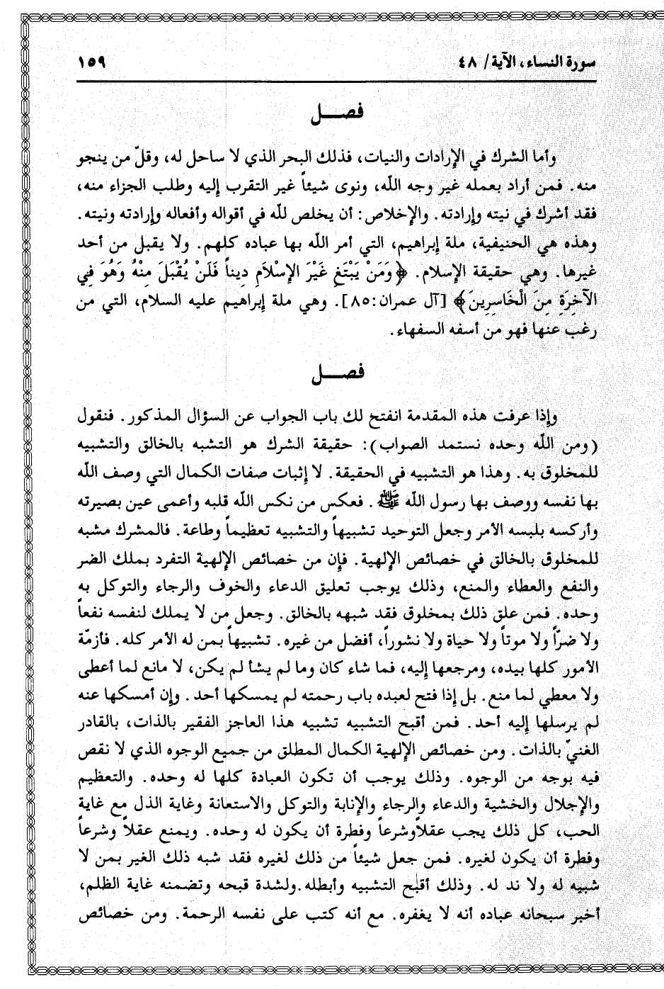 وإذا عرفت هذه المقدمة انفتح لك باب الجواب عن السؤال المذكور. فنقول (ومن الله وحده نستمد الصواب) : حقيقة الشرك هو التشبه بالخالق والتشبيه للمخلوق به. وهذا هو التشبيه في الحقيقة. لا إثبات صفات الكمال التي وصف الله بها نفسه ووصف بها رسول الله صلى الله عليه وسلم. فعكس من نكس الله قلبه وأعمى عين بصيرته وأركسه بلبسه الأمر وجعل التوحيد تشبيها والتشبيه تعظيما وطاعة. فالمشرك مشبه للمخلوق بالخالق في خصائص الإلهية. فإن من خصائص الإلهية التفرد بملك الضر والنفع والعطاء والمنع، وذلك يوجب تعليق الدعاء والخوف والرجاء والتوكل به وحده. فمن علق ذلك بمخلوق فقد شبهه بالخالق. وجعل من لا يملك لنفسه نفعا ولا ضرّا ولا موتا ولا حياة ولا نشورا، أفضل من غيره. تشبيها بمن له الأمر كله. فأزمّة الأمور كلها بيده، ومرجعها إليه، فما شاء كان وما لم يشأ لم يكن، لا مانع لما أعطى ولا معطي لما منع. بل إذا فتح لعبده باب رحمته لم يمسكها أحد. وإن أمسكها عنه لم يرسلها إليه أحد. فمن أقبح التشبيه تشبيه هذا العاجز الفقير بالذات، بالقادر الغنيّ بالذات. ومن خصائص الإلهية الكمال المطلق من جميع الوجوه الذي لا نقص فيه بوجه من الوجوه. وذلك يوجب أن تكون العبادة كلها له وحده. والتعظيم والإجلال والخشية والدعاء والرجاء والإنابة والتوكل والاستعانة وغاية الذل مع غاية الحب، كل ذلك يجب عقلا وشرعا وفطرة أن يكون له وحده. ويمنع عقلا وشرعا وفطرة أن يكون لغيره. فمن جعل شيئا من ذلك لغيره فقد شبه ذلك الغير بمن لا شبيه له ولا ند له. وذلك أقبح التشبيه وأبطله. ولشدة قبحه وتضمنه غاية الظلم، أخبر سبحانه عباده أنه لا يغفره. مع أنه كتب على نفسه الرحمة. ومن خصائص