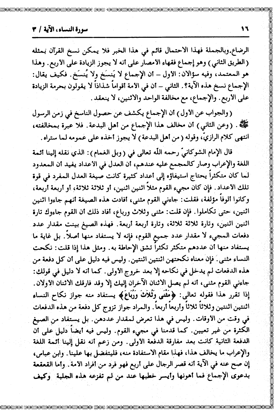 الإجماع نسخ هذه الآية؟ الثاني- أن في الأمة أقواما شذاذا لا يقولون بحرمة الزيادة على الأربع. والإجماع، مع مخالفة الواحد والاثنين، لا ينعقد.