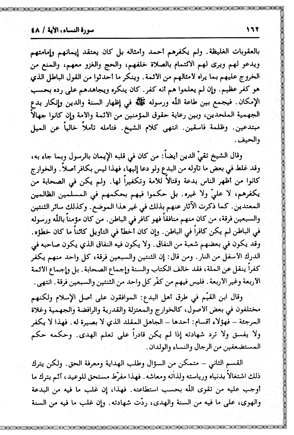 وقد يكون في بعضهم شعبة من النفاق. ولا يكون فيه النفاق الذي يكون صاحبه في الدرك الأسفل من النار. ومن قال: إن الثنتين والسبعين فرقة، كل واحد منهم يكفر كفرا ينقل عن الملة، فقد خالف الكتاب والسنة وإجماع الصحابة. بل وإجماع الأئمة الأربعة وغير الأربعة. فليس فيهم من كفّر كل واحد من الثنتين والسبعين فرقة. انتهى.