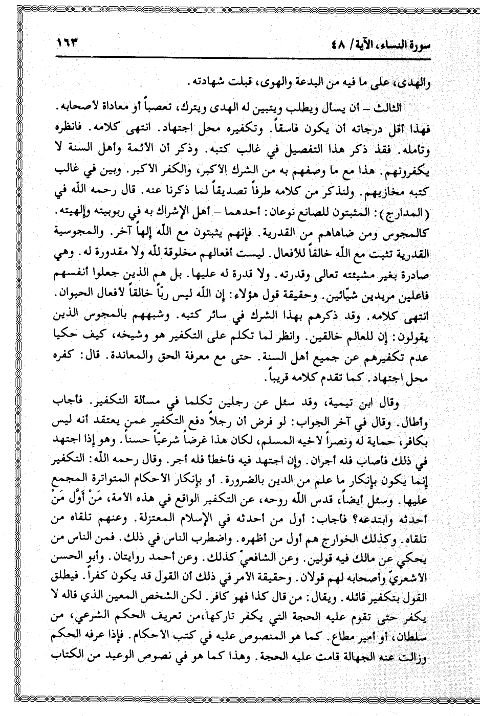 وقال ابن تيمية، وقد سئل عن رجلين تكلما في مسألة التكفير. فأجاب وأطال. وقال في آخر الجواب: لو فرض أن رجلا دفع التكفير عمن يعتقد أنه ليس بكافر، حماية له ونصرا لأخيه المسلم، لكان هذا غرضا شرعيّا حسنا. وهو إذا اجتهد في ذلك فأصاب فله أجران. وإن اجتهد فيه فأخطأ فله أجر. وقال رحمه الله: التكفير إنما يكون بإنكار ما علم من الدين بالضرورة. أو بإنكار الأحكام المتواترة المجمع عليها. وسئل أيضا، قدس الله روحه، عن التكفير الواقع في هذه الأمة، من أوّل من أحدثه وابتدعه؟ فأجاب: أول من أحدثه في الإسلام المعتزلة. وعنهم تلقاه من تلقاه. وكذلك الخوارج هم أول من أظهره. واضطرب الناس في ذلك. فمن الناس من يحكي عن مالك فيه قولين. وعن الشافعيّ كذلك. وعن أحمد روايتان. وأبو الحسن الأشعريّ وأصحابه لهم قولان. وحقيقة الأمر في ذلك أن القول قد يكون كفرا. فيطلق القول بتكفير قائله. ويقال: من قال كذا فهو كافر. لكن الشخص المعين الذي قاله لا يكفر حتى تقوم عليه الحجة التي يكفر تاركها، من تعريف الحكم الشرعي، من سلطان، أو أمير مطاع. كما هو المنصوص عليه في كتب الأحكام. فإذا عرفه الحكم وزالت عنه الجهالة قامت عليه الحجة. وهذا كما هو في نصوص الوعيد من الكتاب