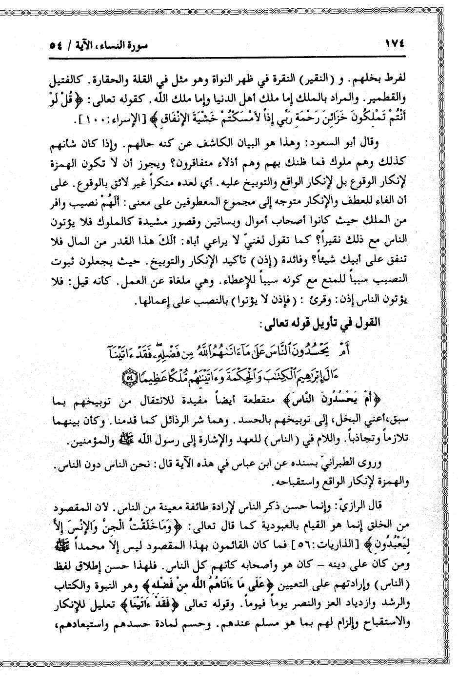 أَمْ يَحْسُدُونَ النَّاسَ عَلى ما آتاهُمُ اللَّهُ مِنْ فَضْلِهِ فَقَدْ آتَيْنا آلَ إِبْراهِيمَ الْكِتابَ وَالْحِكْمَةَ وَآتَيْناهُمْ مُلْكاً عَظِيماً (54)