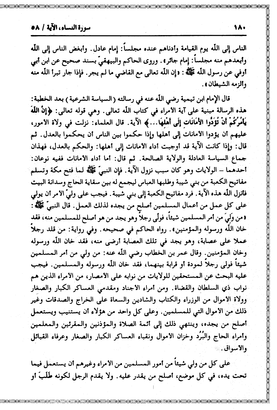 هذه الرسالة مبنية على آية الأمراء في كتاب الله تعالى. وهي قوله تعالى: إِنَّ اللَّهَ يَأْمُرُكُمْ أَنْ تُؤَدُّوا الْأَماناتِ إِلى أَهْلِها ... الآية. قال العلماء: نزلت في ولاة الأمور، عليهم أن يؤدوا الأمانات إلى أهلها وإذا حكموا بين الناس أن يحكموا بالعدل. ثم قال: وإذا كانت الآية قد أوجبت أداء الأمانات إلى أهلها: والحكم بالعدل، فهذان جماع السياسة العادلة والولاية الصالحة. ثم قال: أما أداء الأمانات ففيه نوعان:
