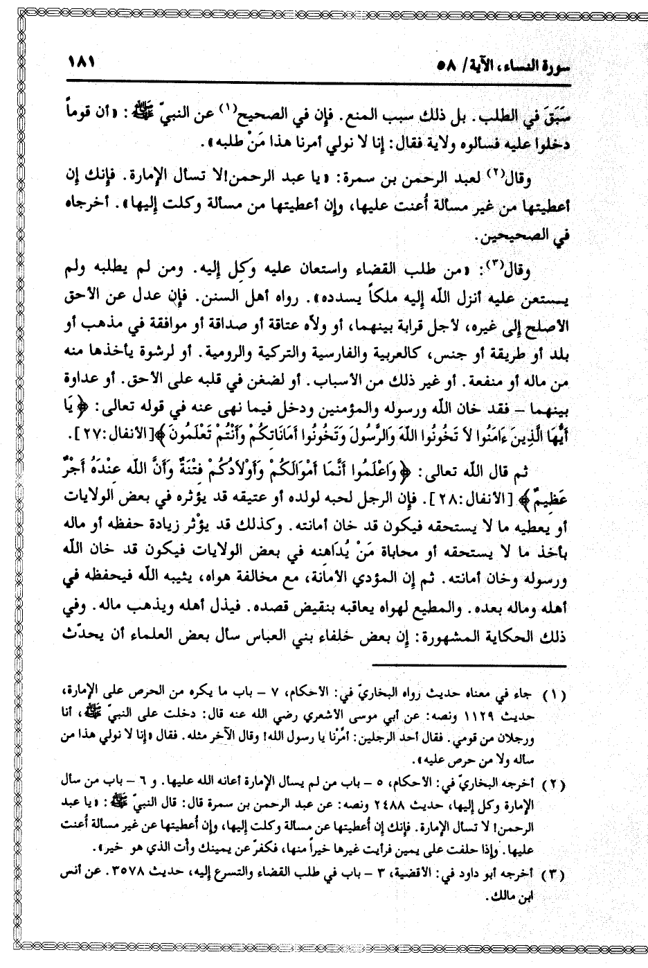 وقال «2» لعبد الرحمن بن سمرة: «يا عبد الرحمن! لا تسأل الإمارة. فإنك إن أعطيتها من غير مسألة أعنت عليها، وإن أعطيتها من مسألة وكلت إليها» . أخرجاه في الصحيحين.