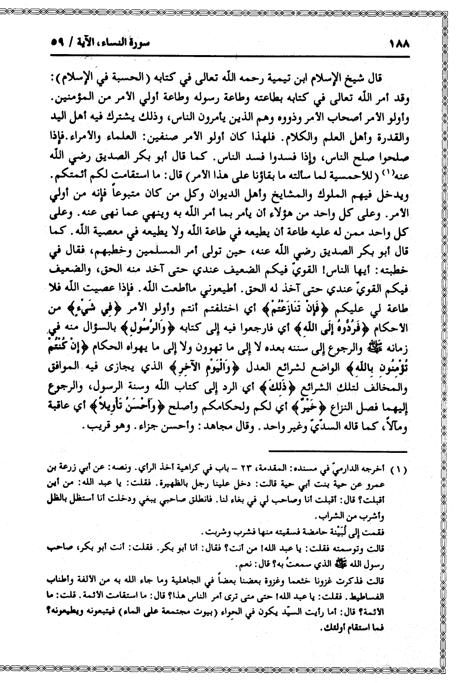 (1) أخرجه الدارميّ في مسنده: المقدمة، 23- باب في كراهية أخذ الرأي. ونصه: عن أبي زرعة بن عمرو عن حية بنت أبي حية قالت: دخل علينا رجل بالظهيرة. فقلت: يا عبد الله: من أين أقبلت؟ قال: أقبلت أنا وصاحب لي في بغاء لنا. فانطلق صاحبي يبغي ودخلت أنا أستظل بالظل وأشرب من الشراب.