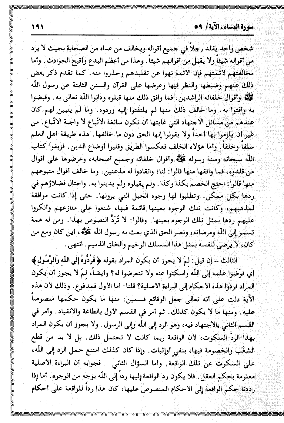 الثالث- إن قيل: لم لا يجوز أن يكون المراد بقوله فَرُدُّوهُ إِلَى اللَّهِ وَالرَّسُولِ أي فوّضوا علمه إلى الله واسكتوا عنه ولا تتعرضوا له؟ وأيضا، لم لا يجوز أن يكون المراد فردوا هذه الأحكام إلى البراءة الأصلية؟ قلنا: أما الأول فمدفوع. وذلك لأن هذه الآية دلت على أنه تعالى جعل الوقائع قسمين: منها ما يكون حكمها منصوصا عليه. ومنها ما لا يكون كذلك. ثم أمر في القسم الأول بالطاعة والانقياد. وأمر في القسم الثاني بالاجتهاد فيه، وهو الرد إلى الله وإلى الرسول. ولا يجوز أن يكون المراد بهذا الردّ السكوت، لأن الواقعة ربما كانت لا تحتمل ذلك. بل لا بد من قطع الشغب والخصومة فيها، بنفي أو إثبات. وإذا كان كذلك امتنع حمل الرد إلى الله، على السكوت عن تلك الواقعة. وأما السؤال الثاني- فجوابه أن البراءة الأصلية معلومة بحكم العقل. فلا يكون رد الواقعة إليها ردا إلى الله بوجه من الوجوه. أما إذا رددنا حكم الواقعة إلى الأحكام المنصوص عليها، كان هذا ردا للواقعة على أحكام