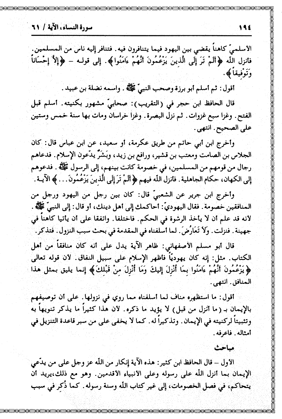الأول- قال الحافظ ابن كثير: هذه الآية إنكار من الله عز وجل على من يدّعي الإيمان بما أنزل الله على رسوله وعلى الأنبياء الأقدمين. وهو مع ذلك، يريد أن يتحاكم، في فصل الخصومات، إلى غير كتاب الله وسنة رسوله. كما ذكر في سبب