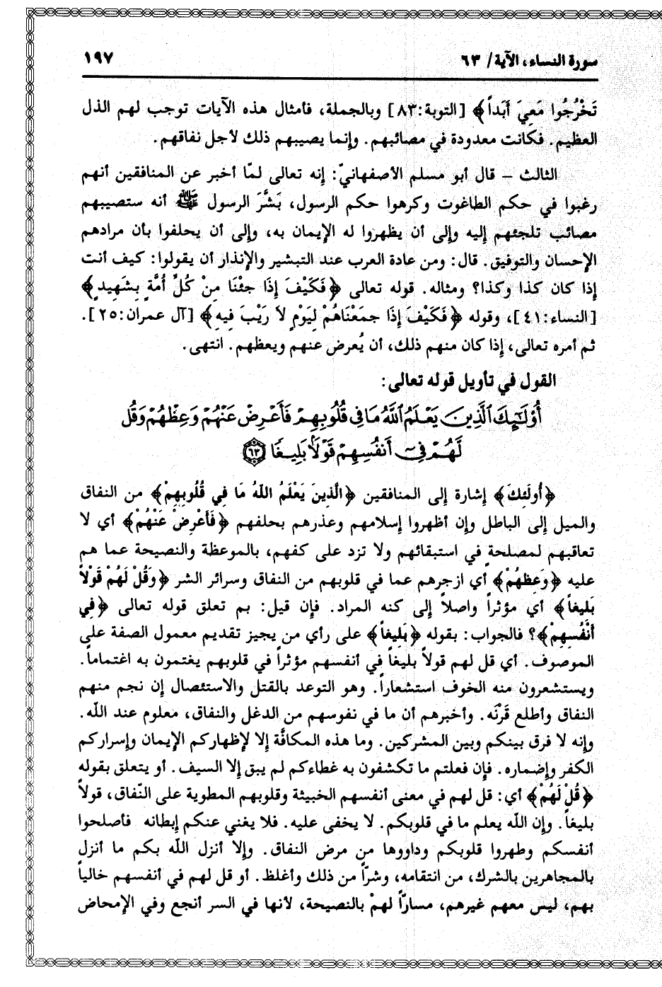 أُولئِكَ الَّذِينَ يَعْلَمُ اللَّهُ ما فِي قُلُوبِهِمْ فَأَعْرِضْ عَنْهُمْ وَعِظْهُمْ وَقُلْ لَهُمْ فِي أَنْفُسِهِمْ قَوْلاً بَلِيغاً (63)