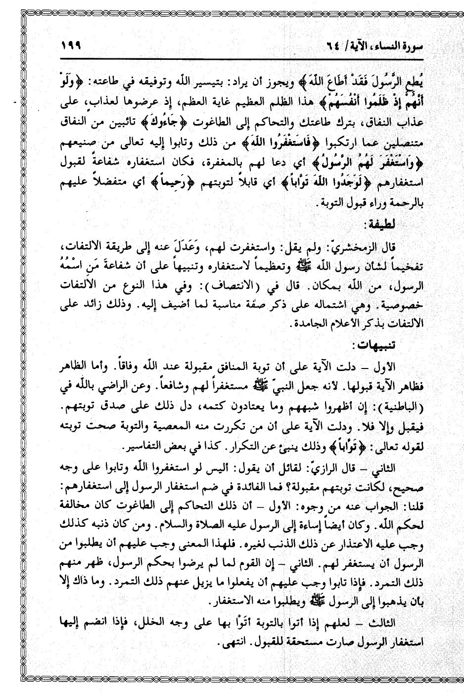 ويجوز أن يراد: بتيسير الله وتوفيقه في طاعته: وَلَوْ أَنَّهُمْ إِذْ ظَلَمُوا أَنْفُسَهُمْ هذا الظلم العظيم غاية العظم، إذ عرضوها لعذاب، على عذاب النفاق، بترك طاعتك والتحاكم إلى الطاغوت جاؤُكَ تائبين من النفاق متنصلين عما ارتكبوا فَاسْتَغْفَرُوا اللَّهَ من ذلك وتابوا إليه تعالى من صنيعهم وَاسْتَغْفَرَ لَهُمُ الرَّسُولُ أي دعا لهم بالمغفرة، فكان استغفاره شفاعة لقبول استغفارهم لَوَجَدُوا اللَّهَ تَوَّاباً أي قابلا لتوبتهم رَحِيماً أي متفضلا عليهم بالرحمة وراء قبول التوبة.