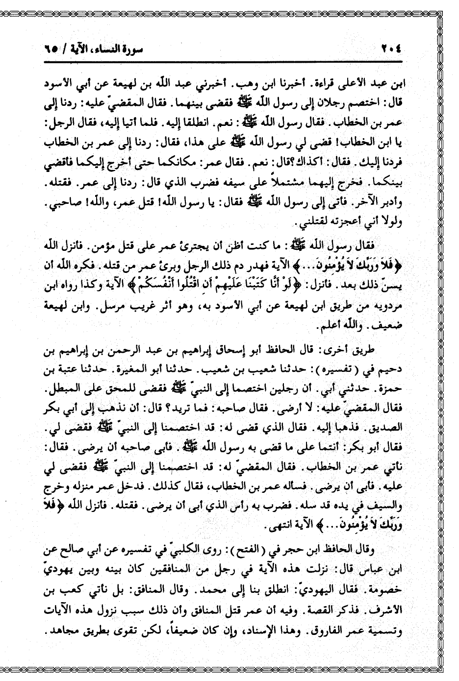 نأتي عمر بن الخطاب. فقال المقضيّ له: قد اختصمنا إلى النبيّ صلى الله عليه وسلم فقضى لي عليه. فأبى أن يرضى. فسأله عمر بن الخطاب، فقال كذلك. فدخل عمر منزله وخرج والسيف في يده قد سله. فضرب به رأس الذي أبى أن يرضى. فقتله. فأنزل الله فَلا وَرَبِّكَ لا يُؤْمِنُونَ ... الآية انتهى.